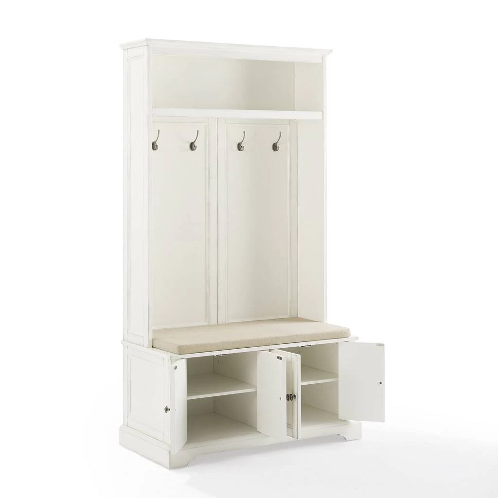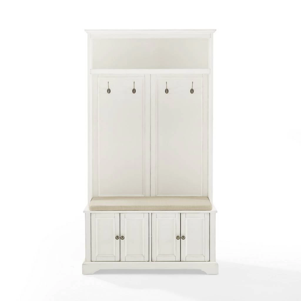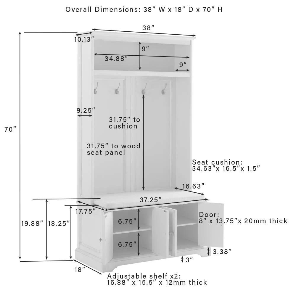 The Holbrook Hall Tree brings vintage charm to any entryway. Featuring a sizable bench and two storage cabinets with adjustable shelves, you can easily sit down and tuck away your shoes at the end of the day. The open stationary shelf corrals smaller items while the four double prong hooks keep coats and hats accessible. Whether you are coming or going, the Holbrook Hall Tree keeps all your everyday items close at hand.