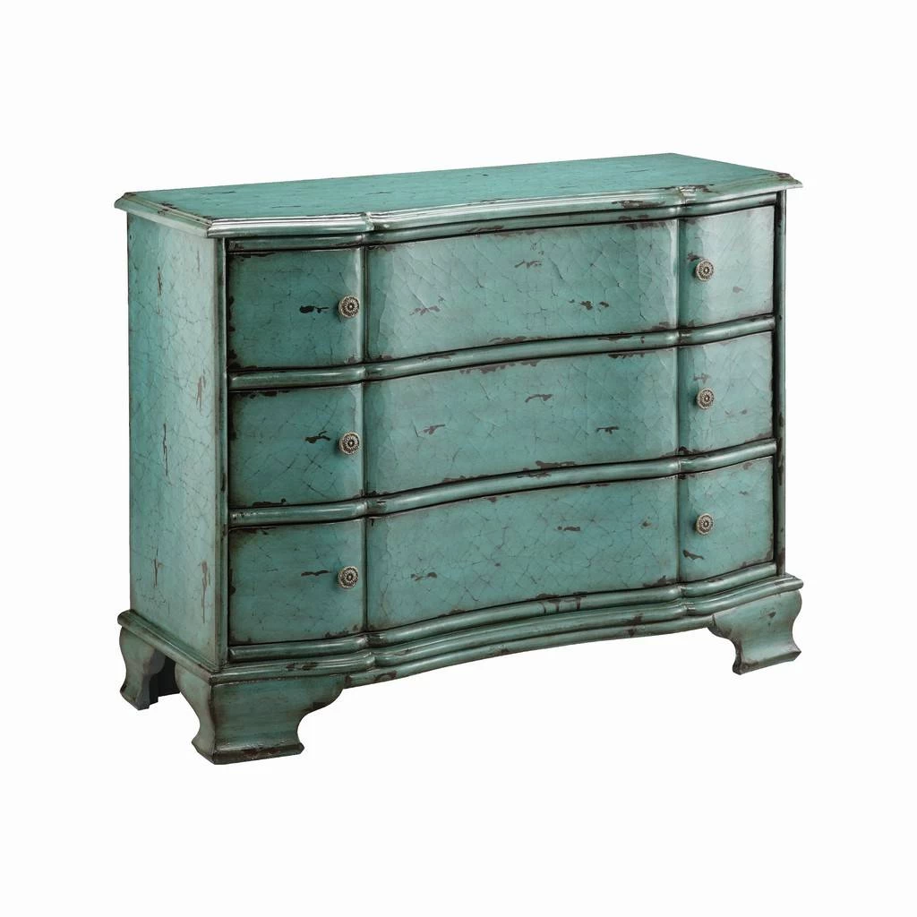 Gently curved accent chest with three drawers, bracket feet, a heavy crackle hand painted vintage turquoise blue finish.
