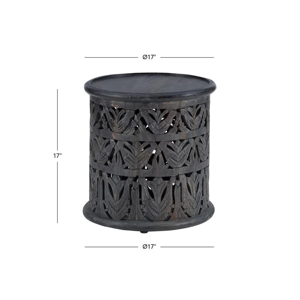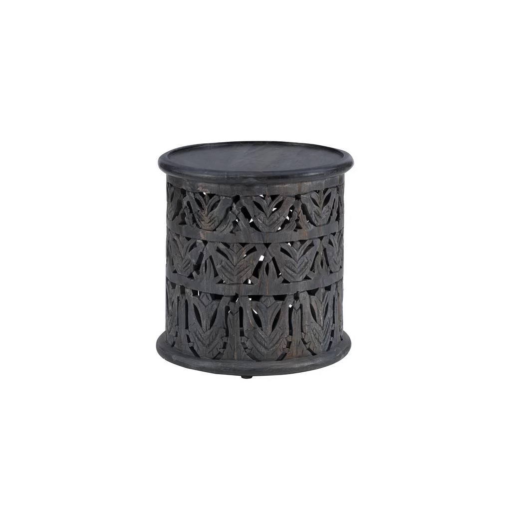 Bring new visual intrigue into your home with this hand carved wood accent table in dark grey. The round silhouette offers a welcome contrast to the angular elements typically found in a space. Use it in any room to hold a lamp, set drinks down, or display your favorite photos. The carved bird design in the sides introduces a bit of boho style and a beautiful texture that is sure to catch the eye. Made of solid mango wood and sealed with a glossy lacquer finish, this sturdy piece arrives fully assembled and is built to last.