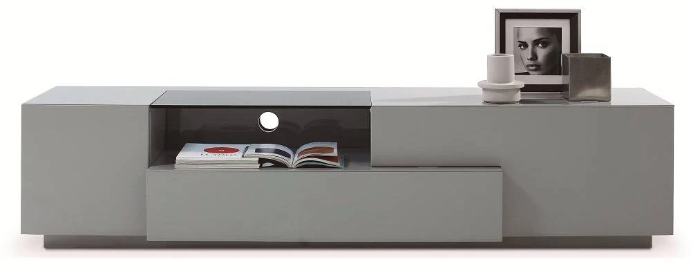 This Entertainment TV Center offers a contemporary look with a clean uncluttered design and functionally multipurpose structure. Crafted from durable wood, wood products and veneers, it is available in the Light Walnut mixed with Black High Gloss, and Blue Star Grey Glass.