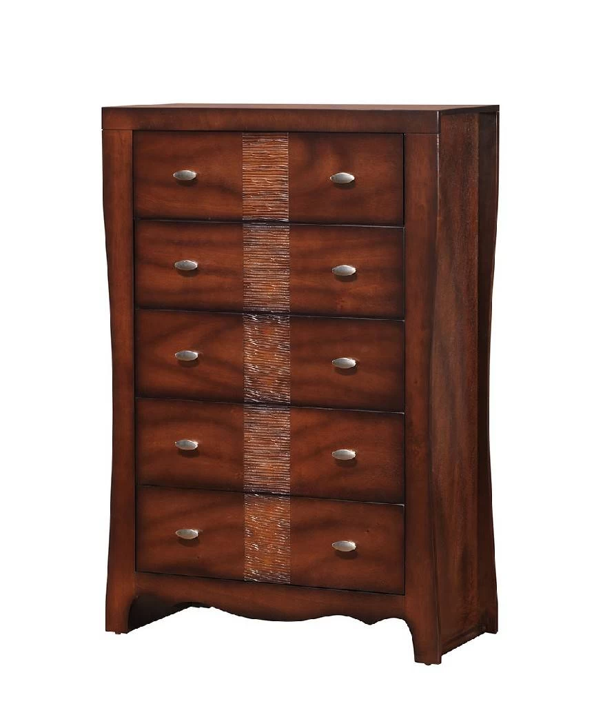 The Jansen 5-Drawer Chest is the perfect addition to your ! This vertical chest features five, spacious drawers; perfect for storing away all of your belongings. The bottom drawer features a dust proofing layer to help protect your belongings. The satin nickel drawer knobs pair beautifully with the espresso finish. The decorative ripple design on the drawer fronts adds extra style to this already stunning piece.