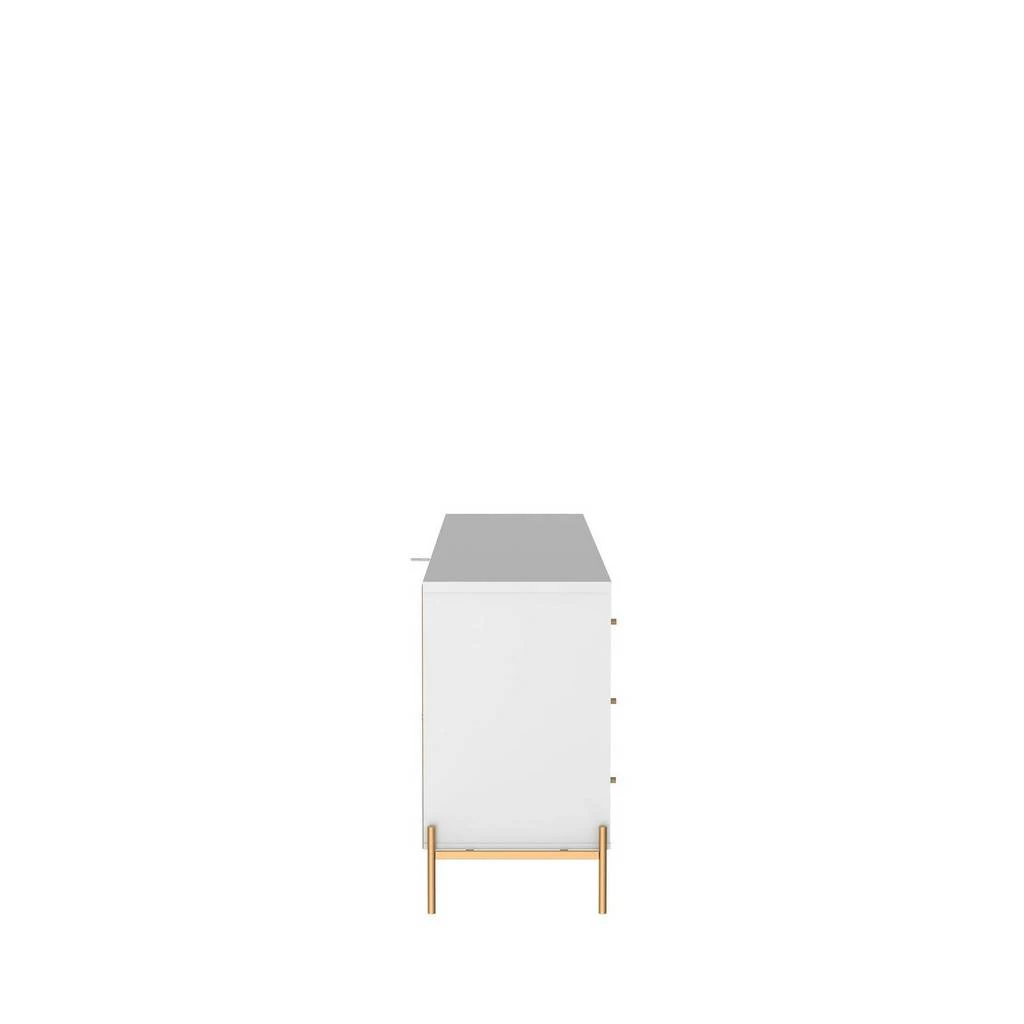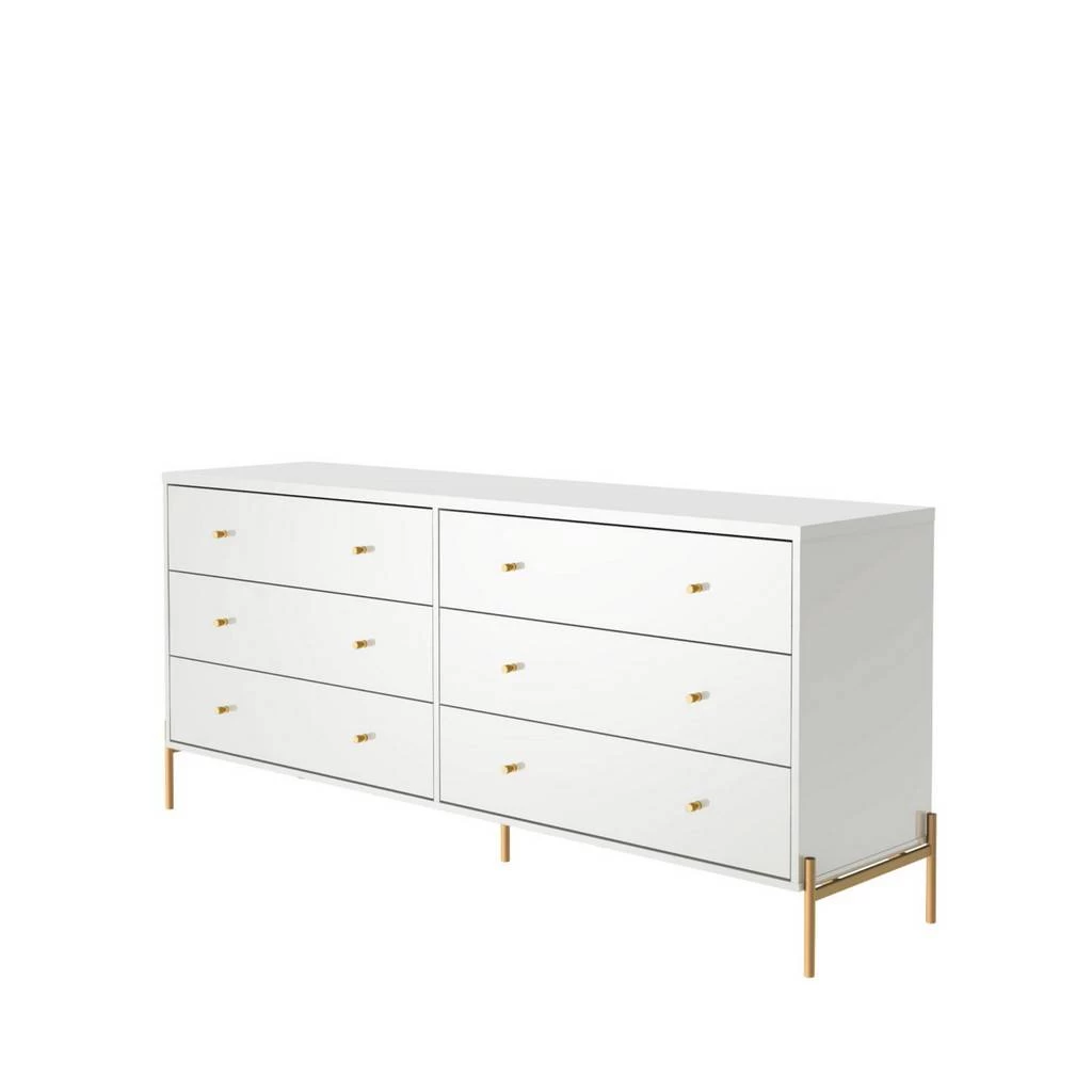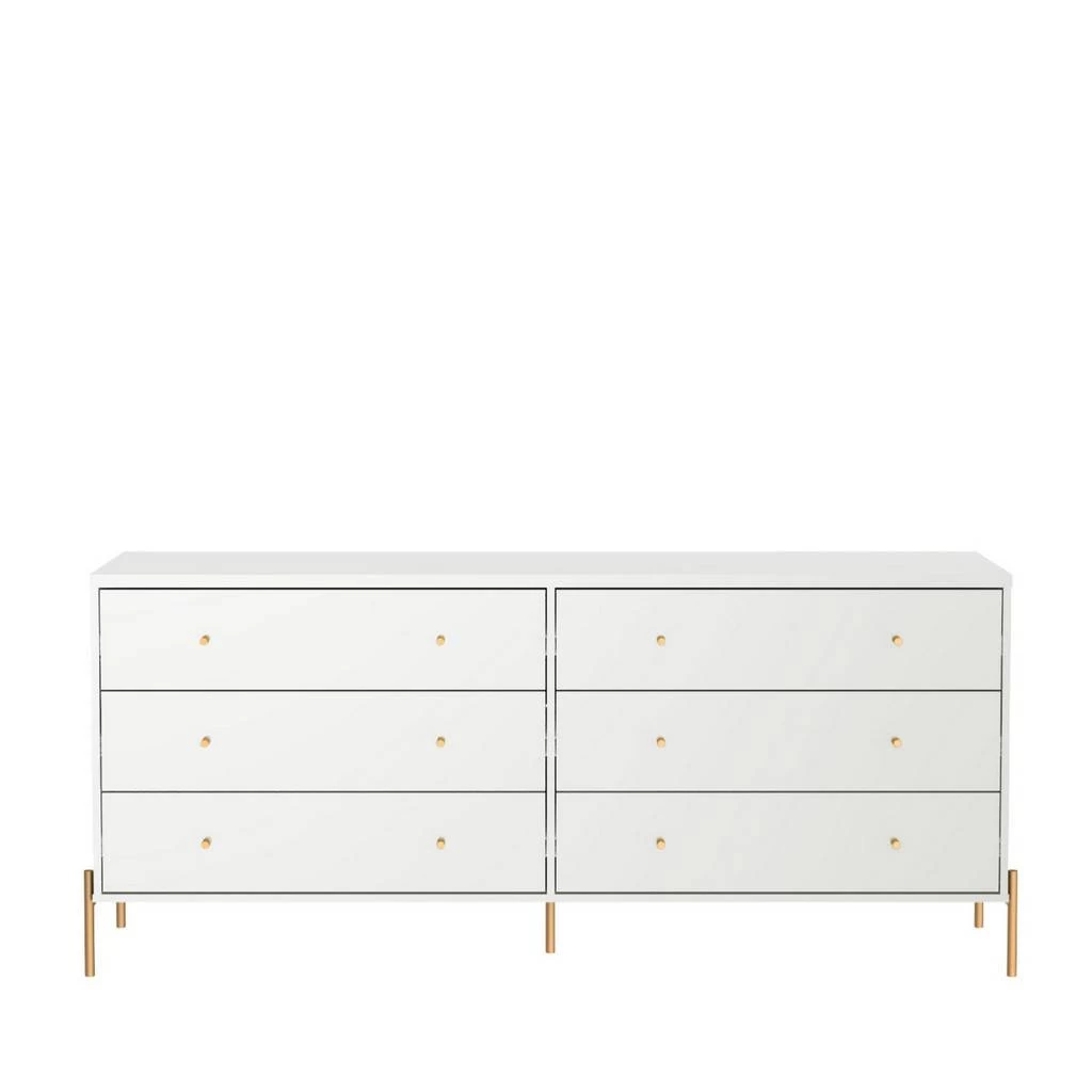 Give your or living room a boost of modern and glam style with the gorgeous Jasper Dresser. The smooth tabletop provides the perfect platform for framed photos and displaying , or daily beauty routine needs. The six rounded gold knob accented full extension drawers allow extra space for versatile and practical use. Completed with gold brushed steel legs, this dresser is the perfect piece to complete your unique and chic space.