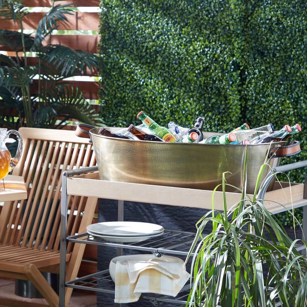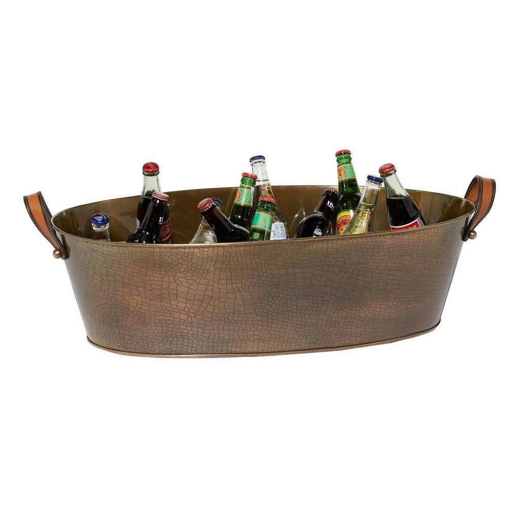 Enjoy your chilled wine, champagne, or beer in style with this contemporary stainless steel bronze bucket cooler with leather handles. Display your wine bottles with style and make everyone thirsty with envy. Looks stylish in your or kitchen as a way to display and serve your favorite wines. This item comes shipped in one carton. Suitable for indoor use only. Made in India. Contemporary theme.