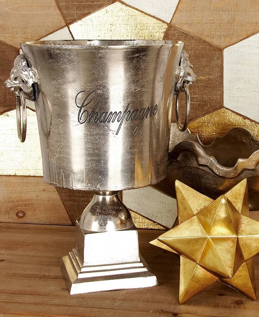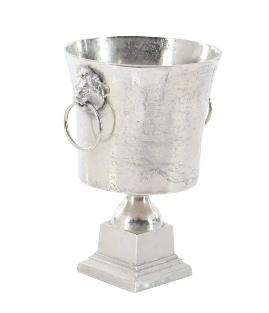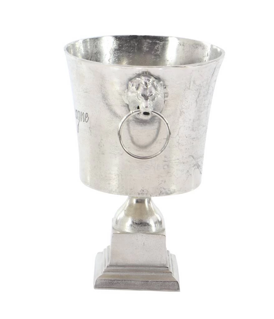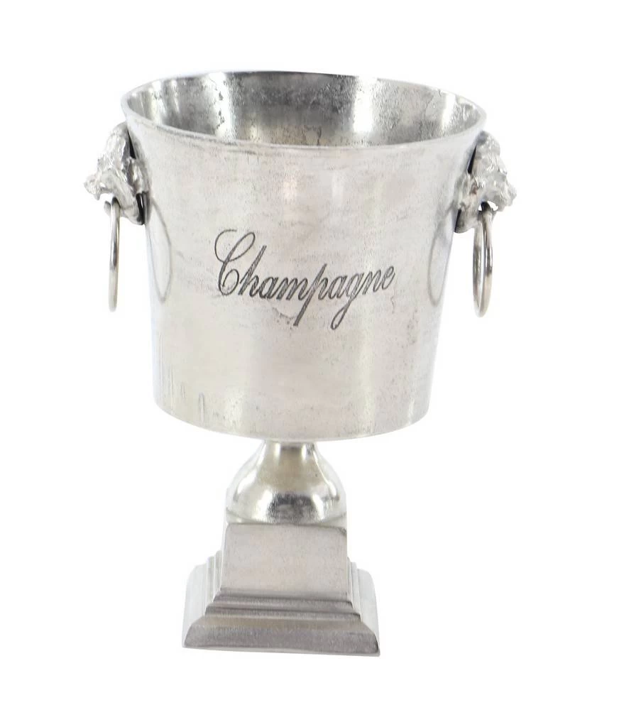Enjoy your chilled wine, champagne, or beer in style with this traditional ice bucket with pillar stand. Display your wine bottles with style and make everyone thirsty with envy. Looks stylish in your or kitchen as a way to display and serve your favorite wines. Designed with black rubber stoppers at the base that prevent scratching furniture and table tops, as well as sliding around. This item comes shipped in one carton. Suitable for indoor use only. Made in India. Showcases “Champagne” in cursive typography. Traditional theme.
