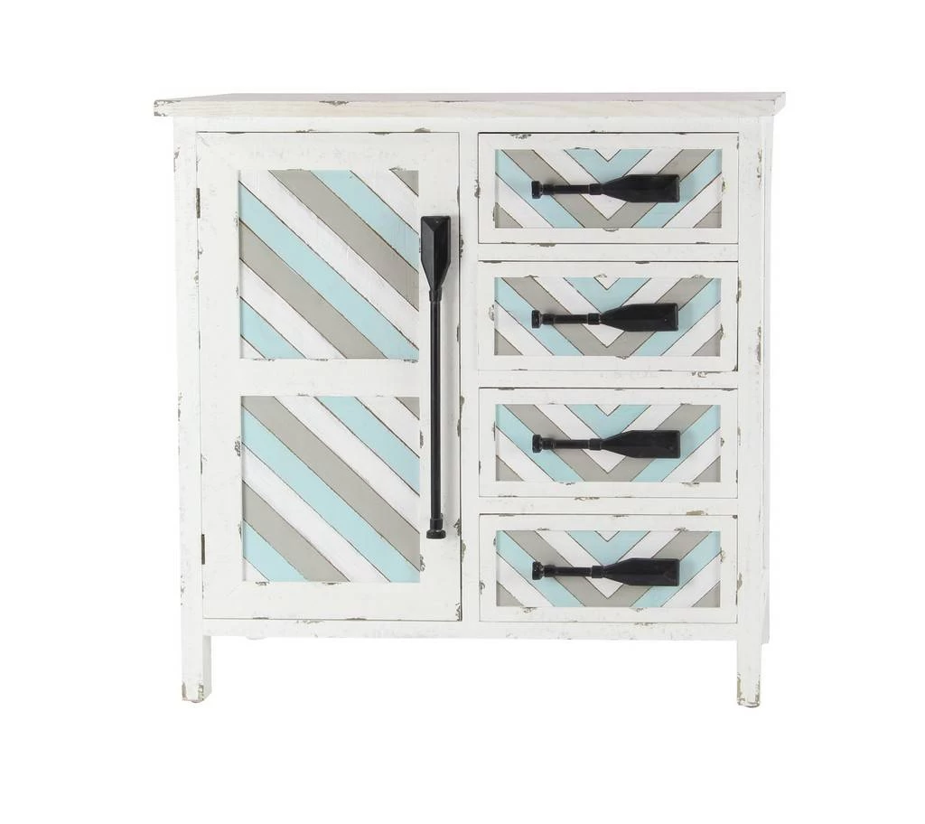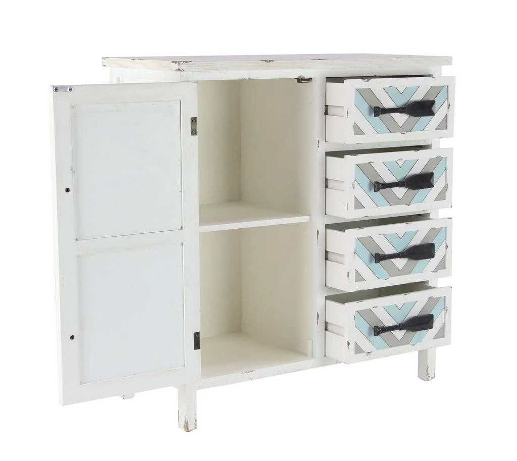 This laid back wooden chest is an excellent addition to your relaxed interior configuration when displayed with matching or colorway. Useful and elegant, chests are more than just a place to store clutter and place a lamp. Add a unique stylish storage to your living room, hallway, or with this chest. Designed with protective stoppers at the base that prevent scratching furniture and table tops, as well as sliding around. Features 2 cabinets that measures 14″L x 13″W x 14″H each. This item comes shipped in one carton. Features 4 drawers that measure 13″L x 11″W x 6″H each. Features one cabinet door and four slide-out drawers. Suitable for indoor use only. Coastal design. Maximum weight limit is 100 lbs