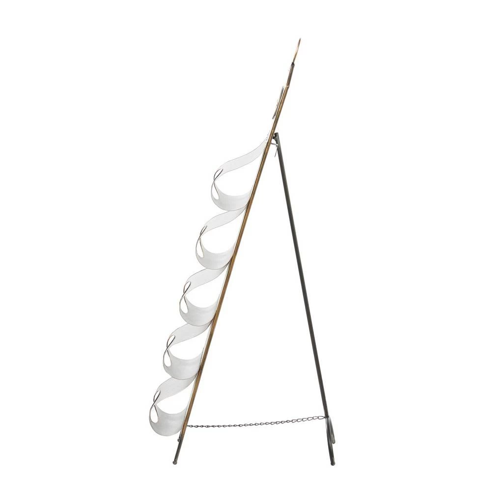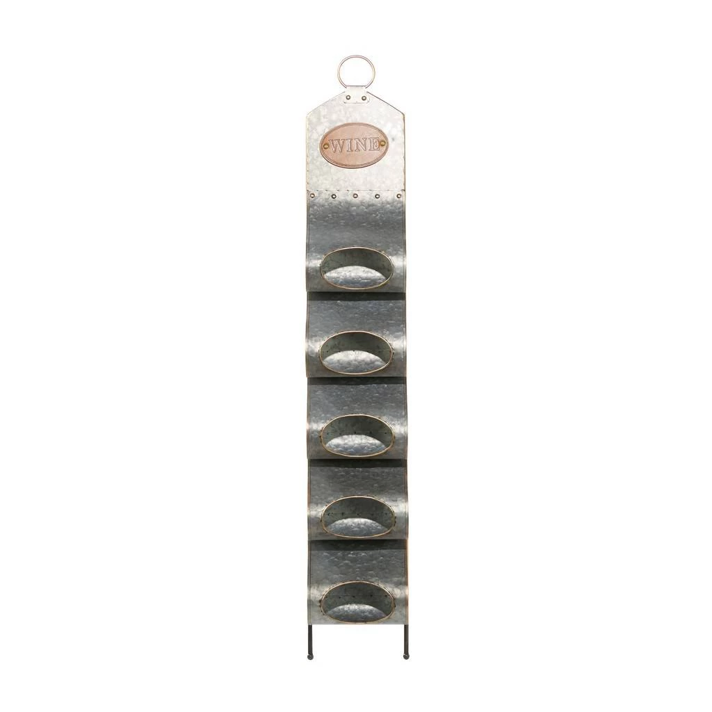 Display your wine bottles with this grey farmhouse 5-bottle metal wine holder with floor stand. Made with galvanized metal, this wine bottle holder is made with 5 metal loops as bottle holders that is securely supported by metal front and back bipod floor stands. It also highlights a faux leather lettered wine label and a single metal ring handle. Placed on your dining or walls, this wine bottle holder is a rustic addition to your farmhouse-themed home. This item comes shipped in one carton. Suitable for indoor use only. This item can sturdily hold 5 wine bottles. The word “WINE” is stamped on the PU leather label. Contemporary design.