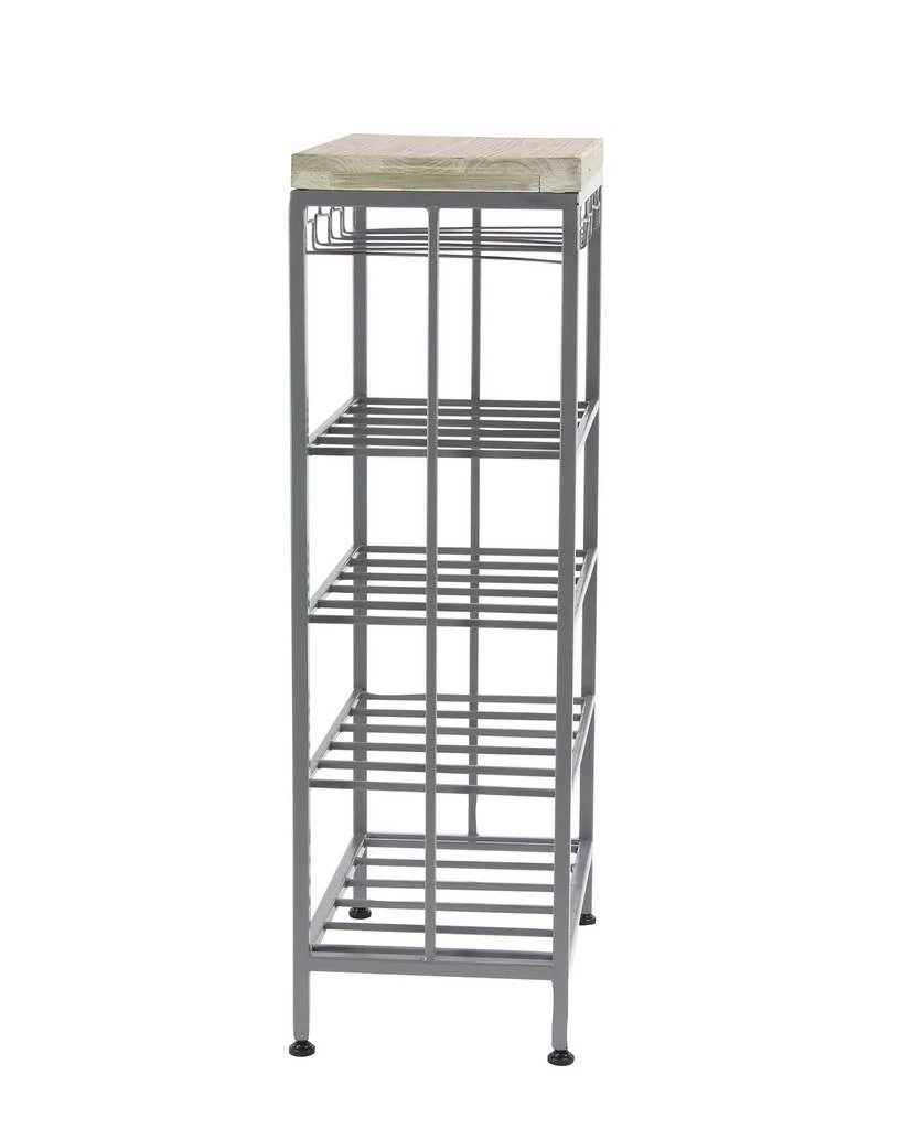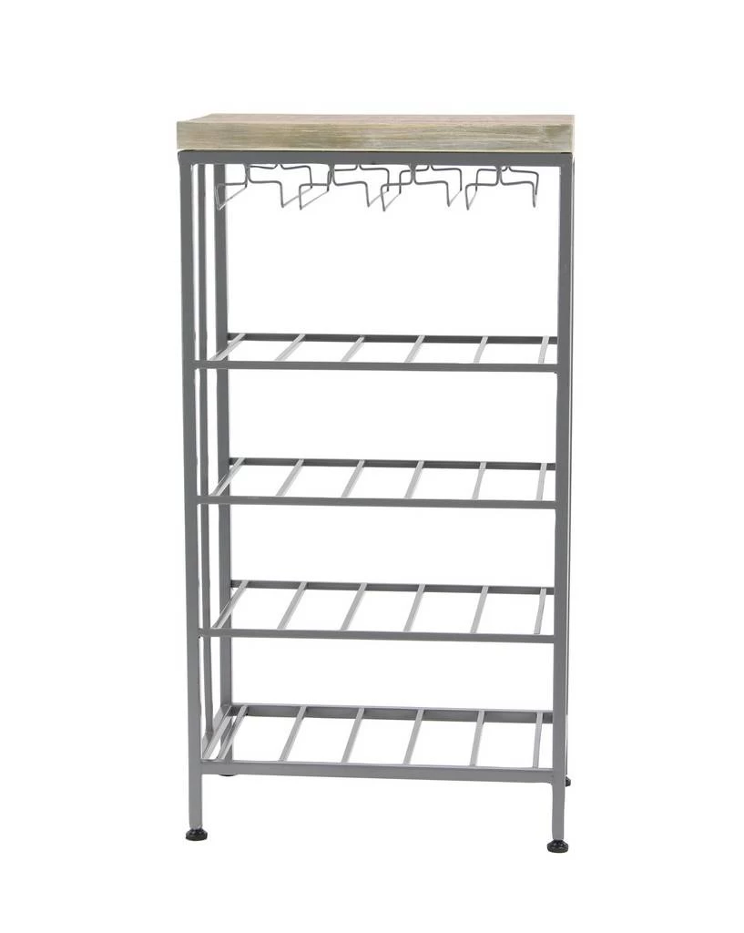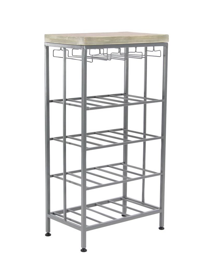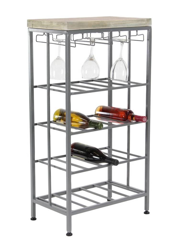 Add this standing wine rack to your contemporary dining room or kitchen. Display your wine bottles with style and make everyone thirsty with envy. Looks stylish in your or kitchen as a way to display and serve your favorite wines. Designed with rubber stoppers at the base that prevent scratching furniture and table tops, as well as sliding around. This item comes shipped in one carton. This rack has four metal shelves and a rectangular top. Suitable for indoor use only. This wine rack includes 4 shelves. This wine rack can hold 20 bottles. Contemporary design. Maximum weight limit is 100 lbs