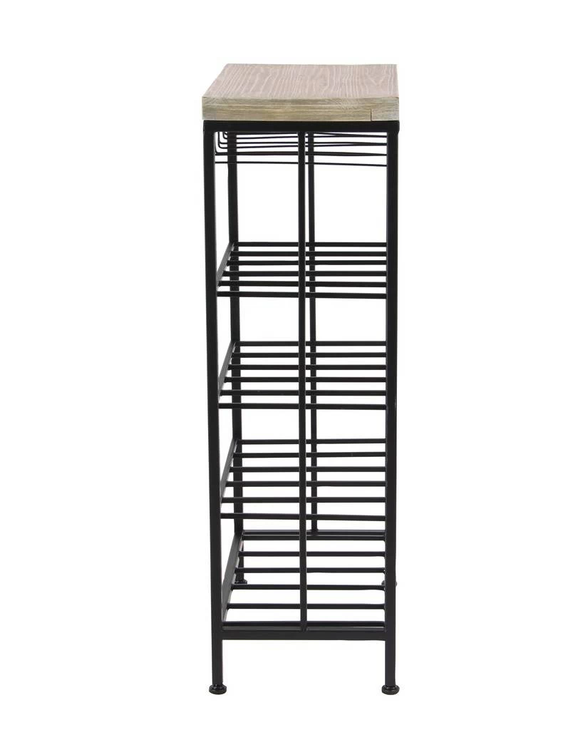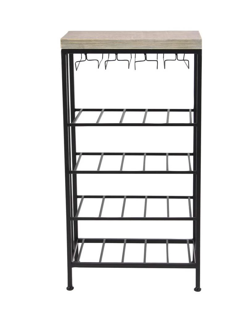 This industrial-inspired wine storage provides you a perfect wine bottle and glass storage solution. Display your wine bottles with style and make everyone thirsty with envy. Looks stylish in your or kitchen as a way to display and serve your favorite wines. It is designed with round stoppers at the base that prevent scratching and sliding. This item comes shipped in one carton. Suitable for indoor use only. A wine storage with 4 metal shelves. This metal and wood wine storage has a storage capacity of 15 bottles. Industrial theme