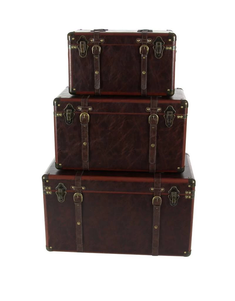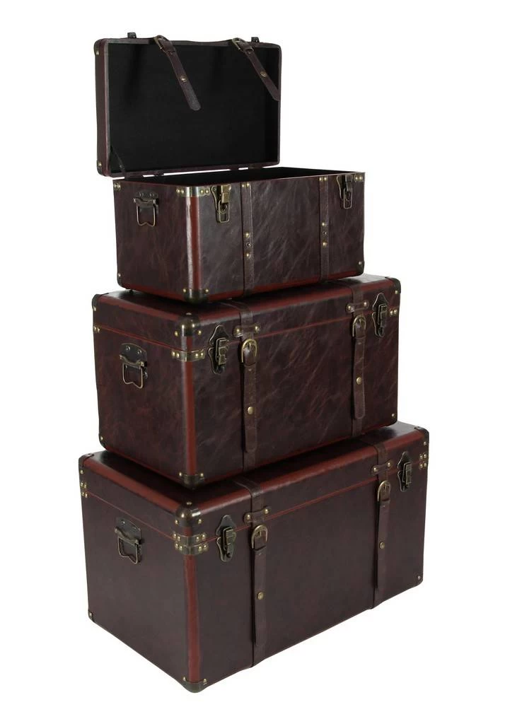 These brown wood and leather trunks combine organization and style, perfect to display in your or . In your entryway, hallway, kitchen or bedroom, add some storage with some style with this trunk. Great for out of season coats, purses, bookbags, and scarves, this trunk is as functional as it is stylish. This item comes shipped in one carton. Suitable for indoor use only. These trunks come as a set of 3. Traditional theme