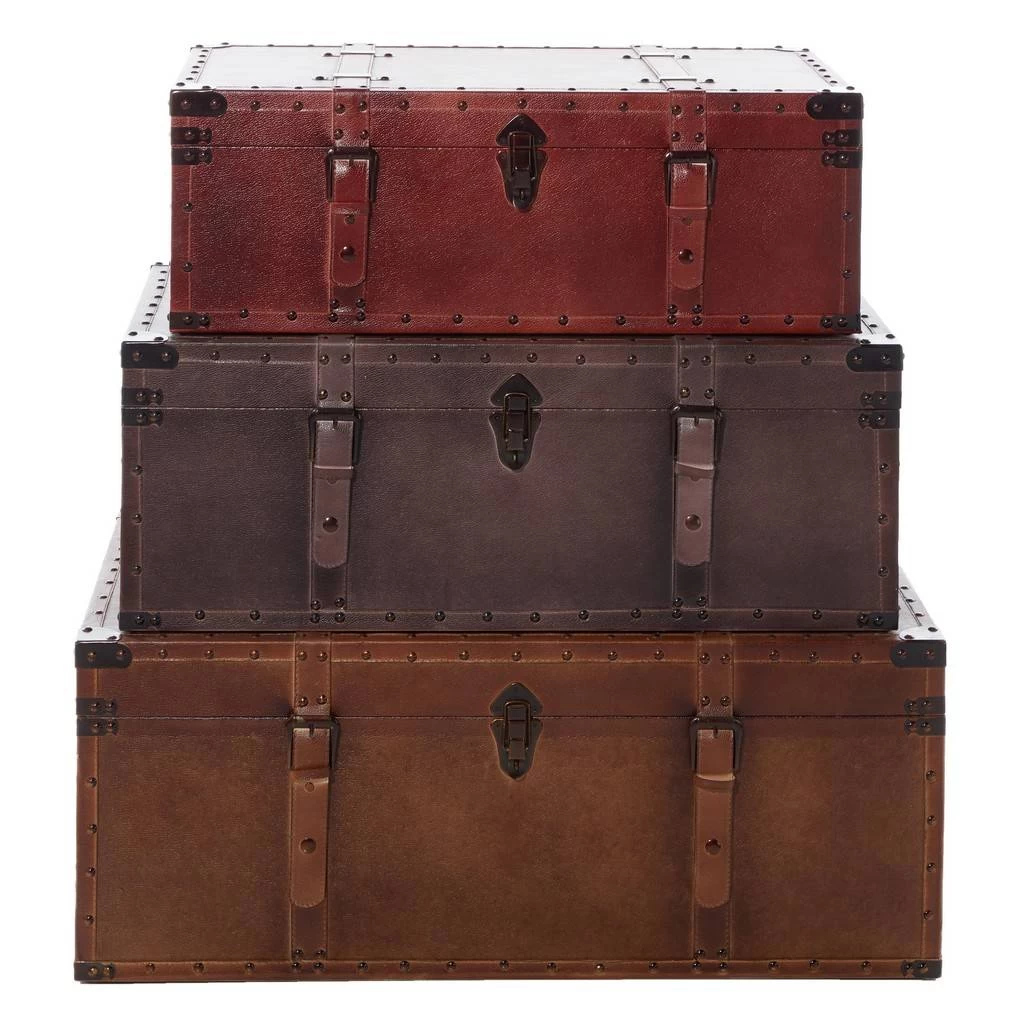 Bring a rustic charm with these rustic trunks as storage boxes, coffee tables, or corner fillers in your home spaces. In your entryway, hallway, kitchen or , add some storage with some style with this trunk. Great for out of season coats, purses, bookbags, and scarves, this trunk is as functional as it is stylish. This item comes shipped in one carton. Suitable for indoor use only. Set of 3 leather and wood storage trunks. Rustic theme