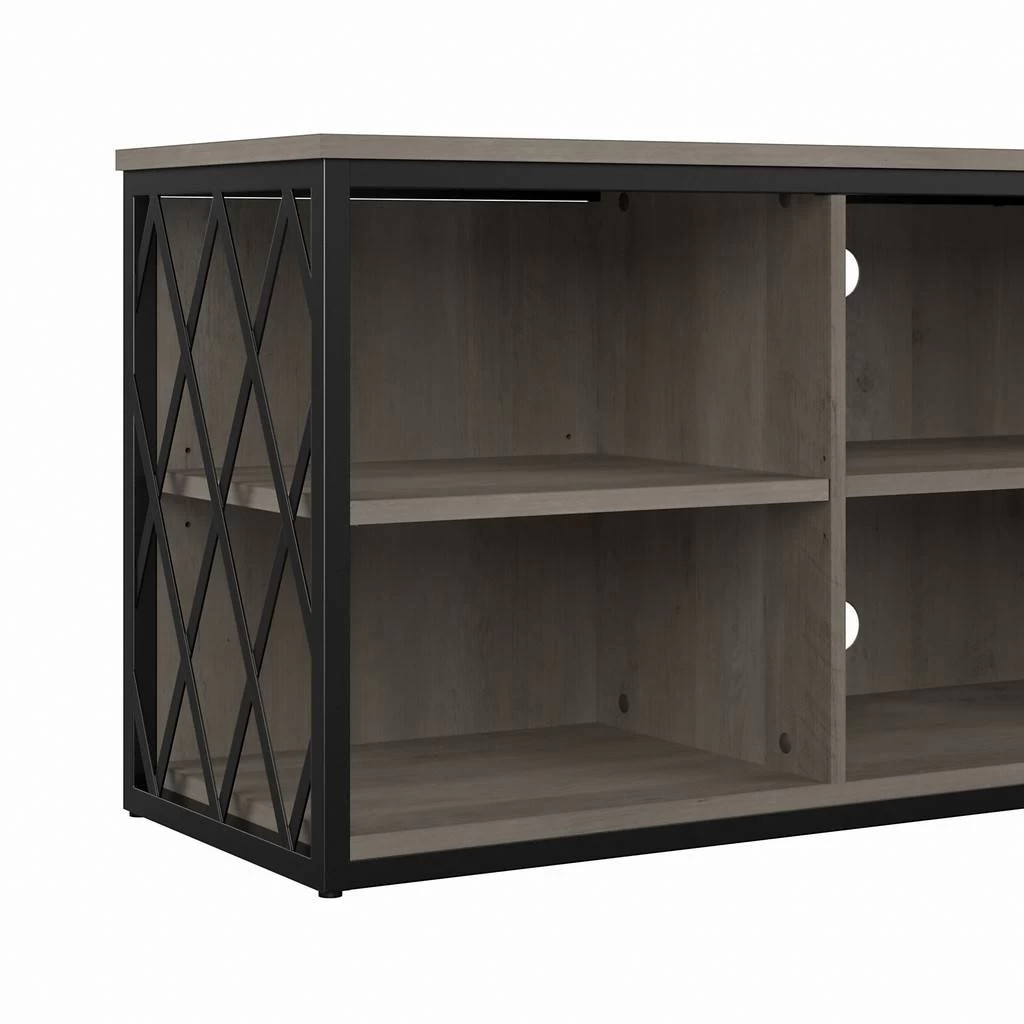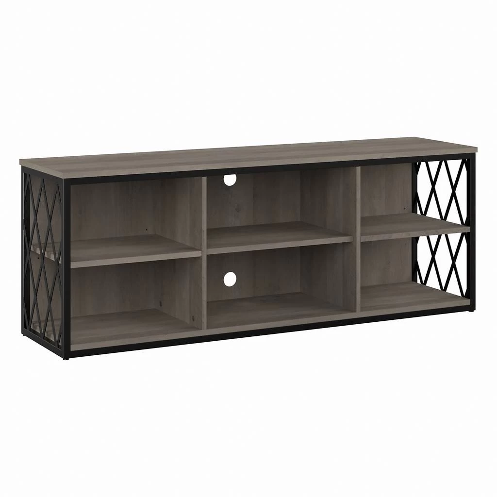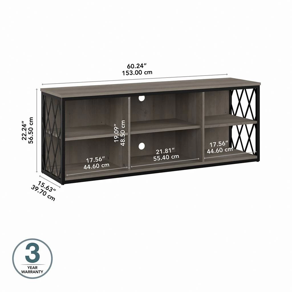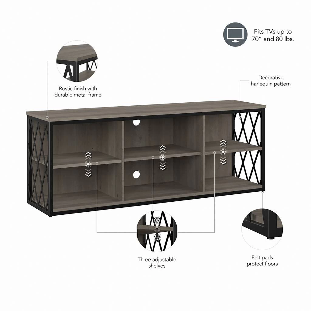 The kathy ireland Home by Bush Furniture City Park 60W Industrial TV Stand for 70 Inch TV is the ideal statement piece for your movie nights. Designed with your safety in mind, this media unit includes a stable design, a counterweighted back panel, and wall attachment hardware for family-friendly safety. The rustic finish and decorative harlequin pattern work together to create a modern industrial look in any or loft-style home. Catch up on your favorite shows with a TV console that supports up to a 70 inch television and/or 80 pounds. The three adjustable shelves allow for flexible storage of your video games, DVDs, and more. Easily conceal and organization wires from your electronics thanks to the cable management cut outs on the central back panel of the entertainment stand. Use the open storage for your larger gaming consoles and media players, and rest easy knowing that your television and accessories are safely supported thanks to the durable metal frame. This modern TV stand is tested to meet ANSI/SOHO quality standards for safety and performance and is backed by a 3 Year Manufacturer’s Warranty. Complete the look of your living room by coordinating the media console with the City Park Bookcase, Console Table, or Coffee Table (coordinating items sold separately). See the full City Park Collection for a variety of coordinating items to create a cohesive in your home.