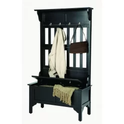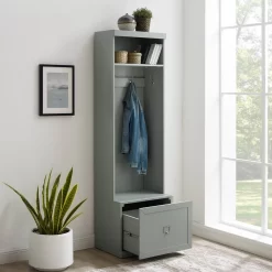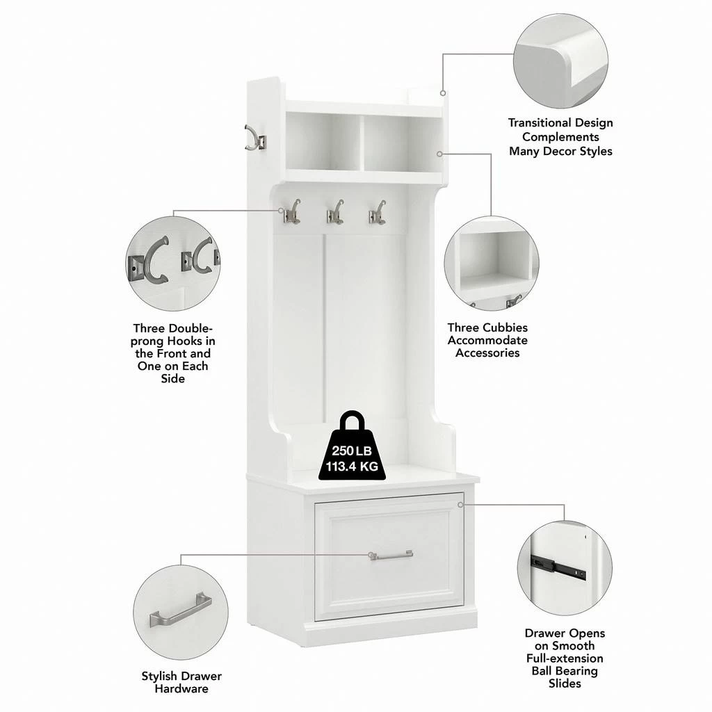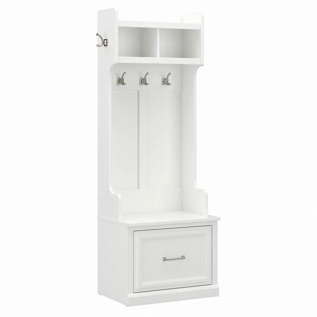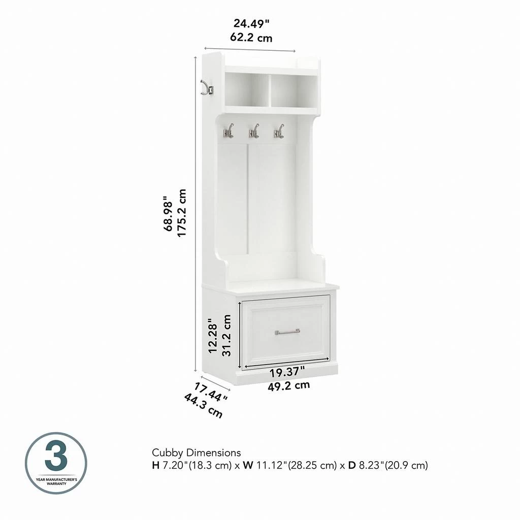 The kathy ireland® Home by Bush Furniture Woodland 24W Hall Tree and Small Shoe Bench with Drawer combines transitional styling and a practical design to offer an ideal entryway organizer. Have a seat on the durable bench surface and take a moment to relax as you get ready to head out the door or come home after a long day. The top of the mudroom bench supports up to 250 pounds, so you can sit down to put on and take off your shoes or set shopping bags down after a trip to the store with confidence. A small drawer opens on smooth full-extension ball bearing slides for easy access to footwear and accessories. The narrow Hall Tree features three Weathered Nickel coat hooks in the front and one on each side for hanging jackets, hats, scarves and more. Smaller items like gloves and keys can be stashed neatly inside two open compartments, and the top shelf provides an area to brighten up your entryway with decorations. The storage bench’s transitional design blends elements of contemporary and traditional styling to complement a wide range of home furnishings while your choice of Cape Cod Gray, White Ash and Ash Brown finish options make it easy to find the perfect look for your space. This entryway bench with storage has been rigorously tested to meet Bush Furniture’s standards for safety, performance and durability and is backed by a 3 Year Manufacturer’s Warranty. See the full Woodland Collection to complete your home’s entryway, mudroom or foyer with style.