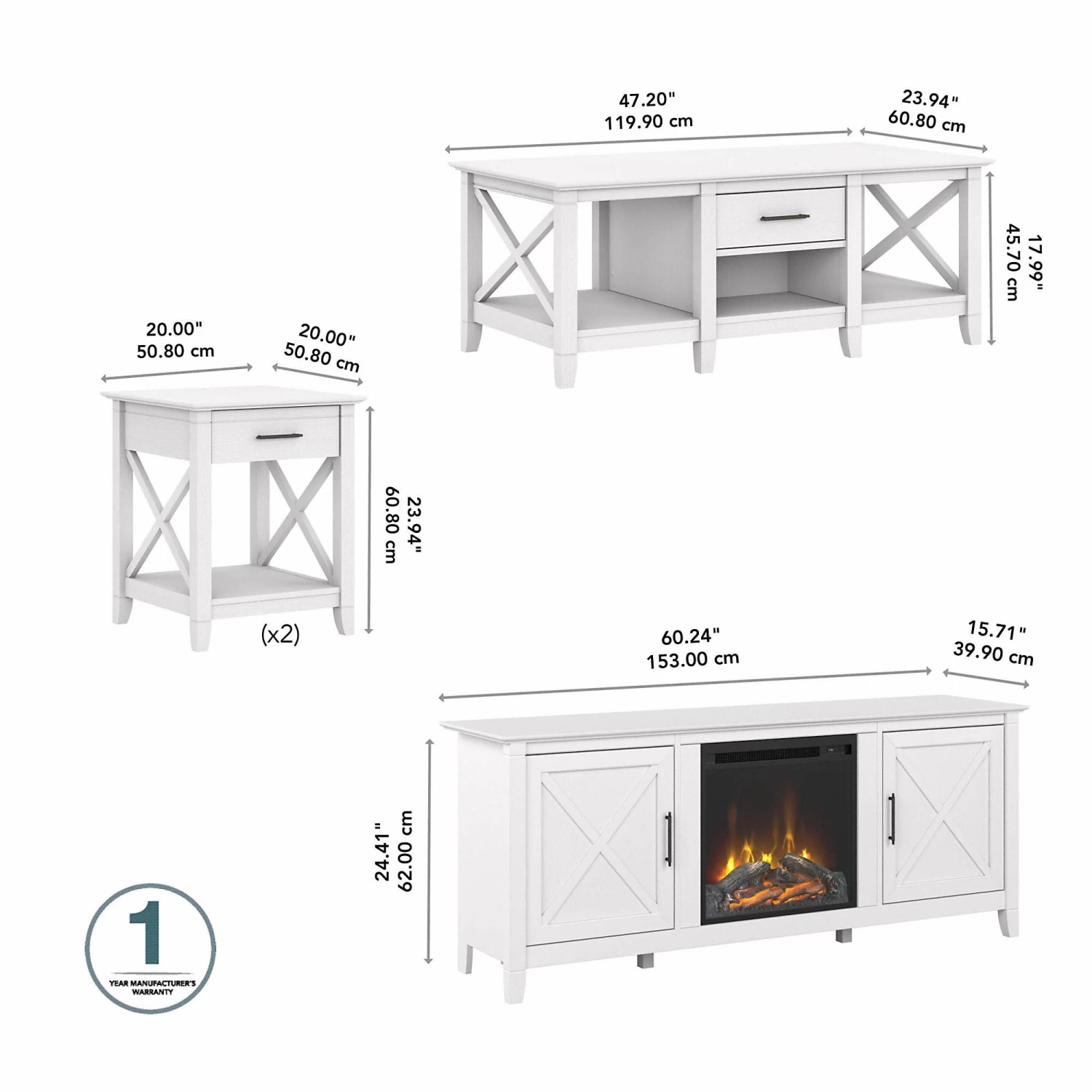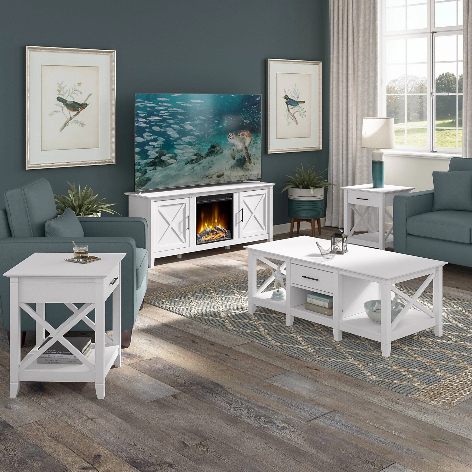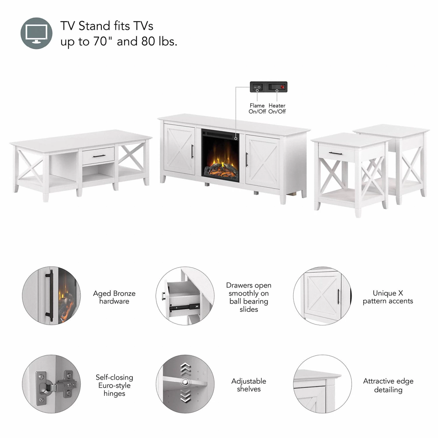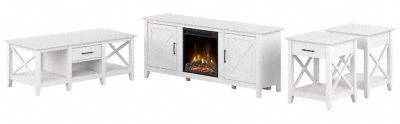 The Bush Furniture Key West Fireplace TV Stand for 70 Inch TV with Coffee Table and End Tables features plenty of storage for media essentials along with an easy-going style that’s perfect for casual homes. Get together with friends and family for movie night around an entertainment center that supports up to a 70-inch television and/or 80 pounds. Open center compartment and two storage cabinets each contain one adjustable shelf to accommodate items of various sizes. 18-inch electric fireplace (1400 watts, 120 voltage) heats spaces up to 1000 square feet; display also works without heat to create a relaxing ambiance in any climate. TV Stand comes with an Anti-Tip Restraint Wall Anchor and a counterweighted back panel for family-friendly use. Each side of the low Coffee Table has a box drawer above an open cubby for organizing miscellaneous items. Larger compartments to the right and left add plenty of room for home or additional storage. The matching End Tables also include a drawer for smaller accessories like TV remotes and writing utensils while the surface supports a lamp, plant, or pictures. A post leg design, X pattern accents and your choice of several finish options convey a casual appearance that works well with cottage, coastal and modern farmhouse styling. This TV stand with storage has been rigorously tested to meet or exceed industry standards for safety, durability and performance and is backed by the Bush Furniture 1 Year Manufacturer’s Warranty.