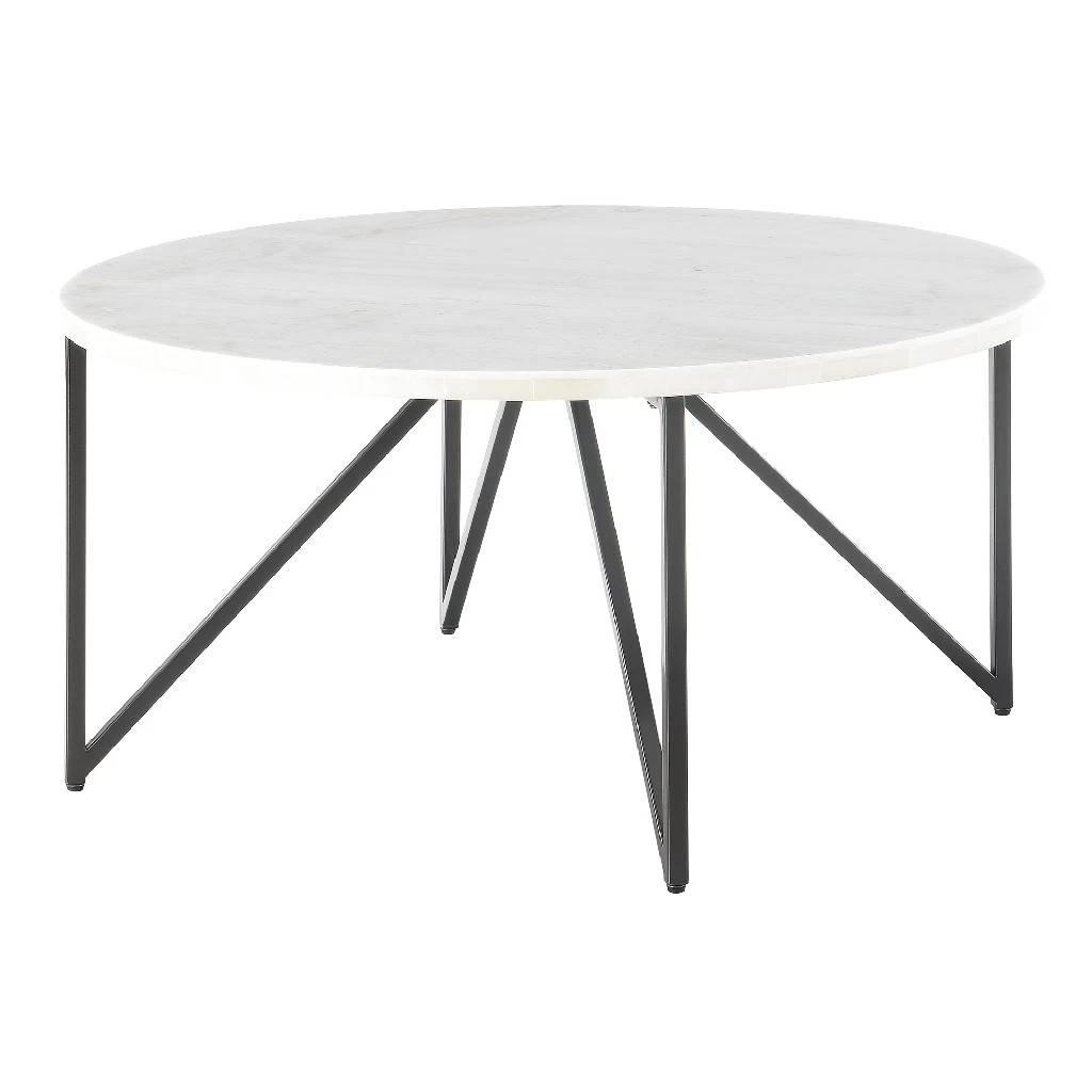 The Kinsler Round Coffee Table is chicness goals! This coffee table has a white, marble table top and sleek, black metal legs. The contemporary design, will easily go with any existing décor or can be a great excuse to redo your entire ! The legs feature a cool design and instantly update the look of the traditional coffee table. Add this coffee table to your home today for the perfect, chic look!