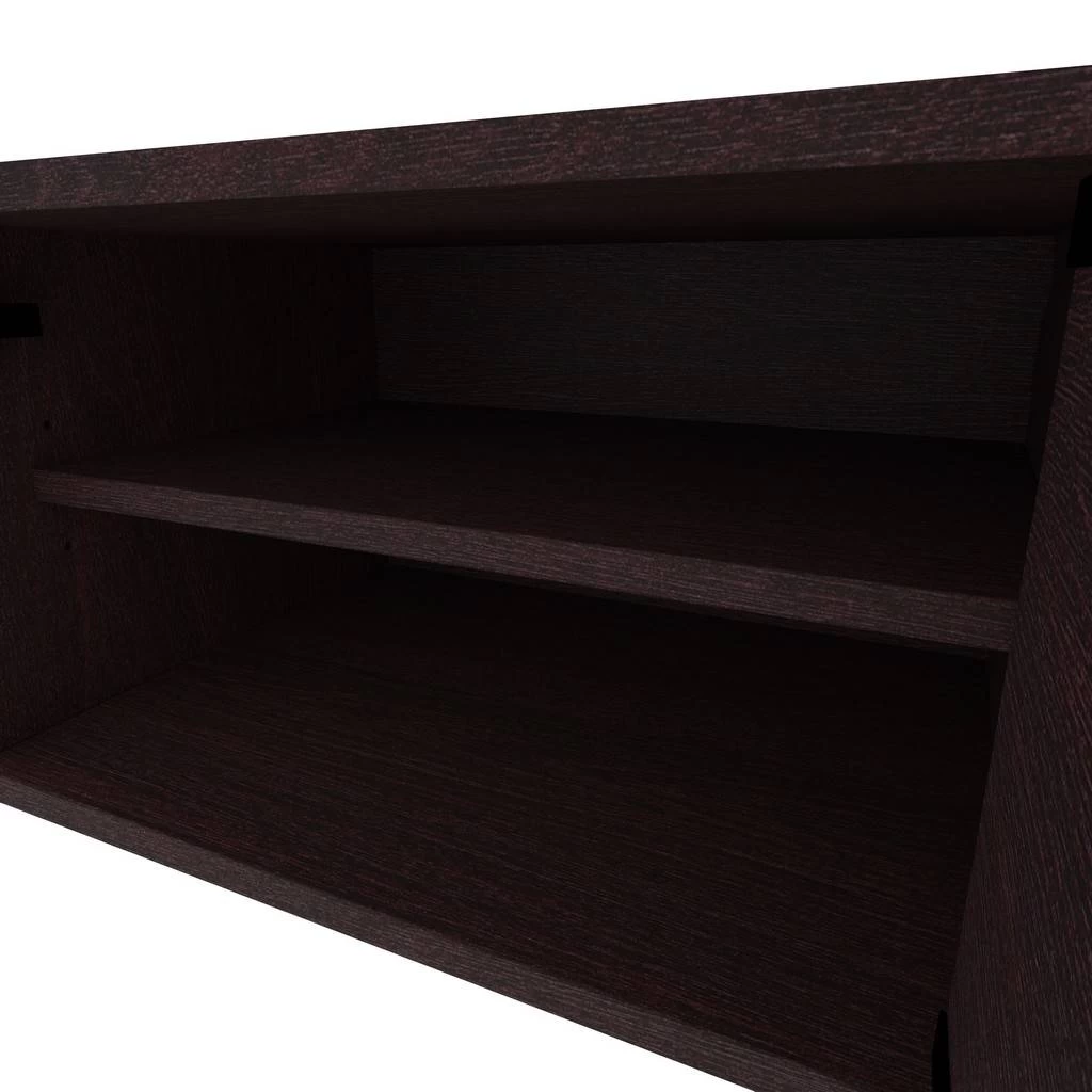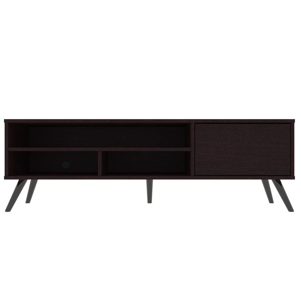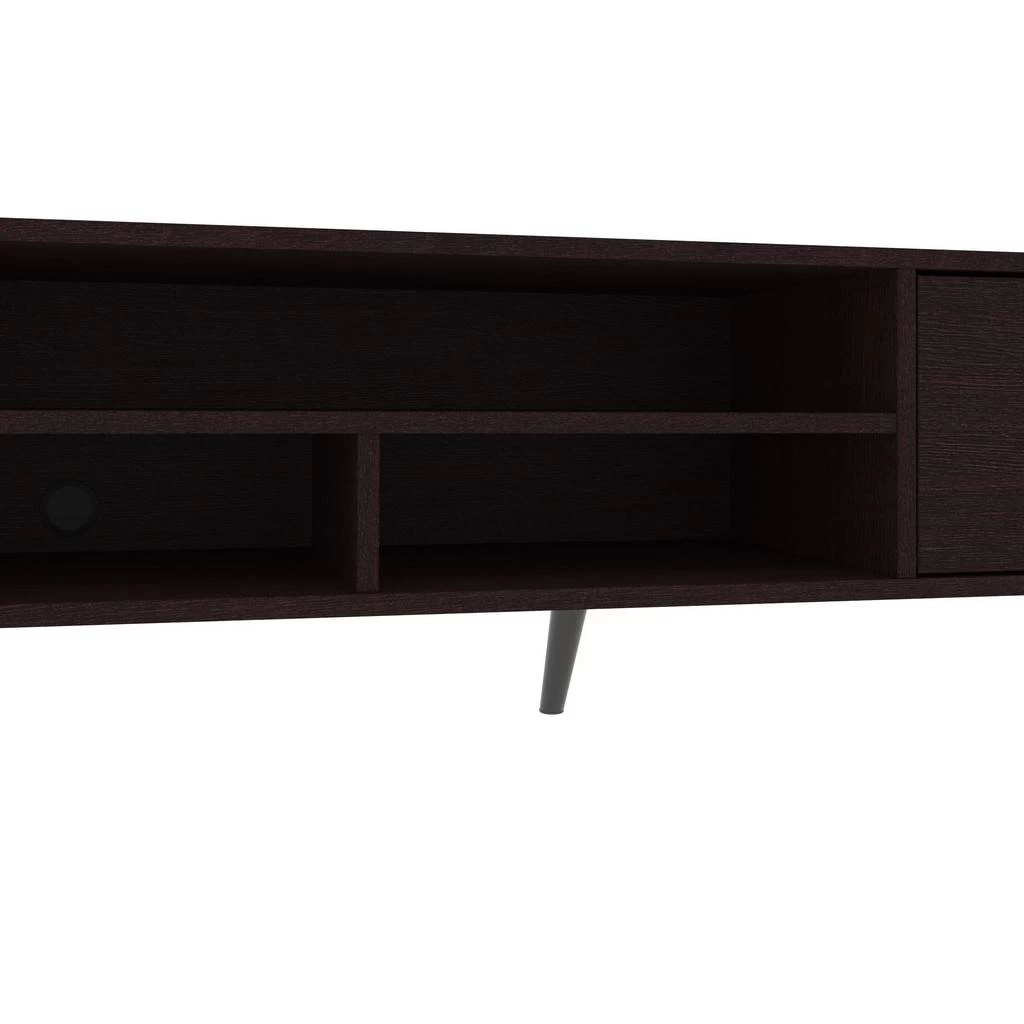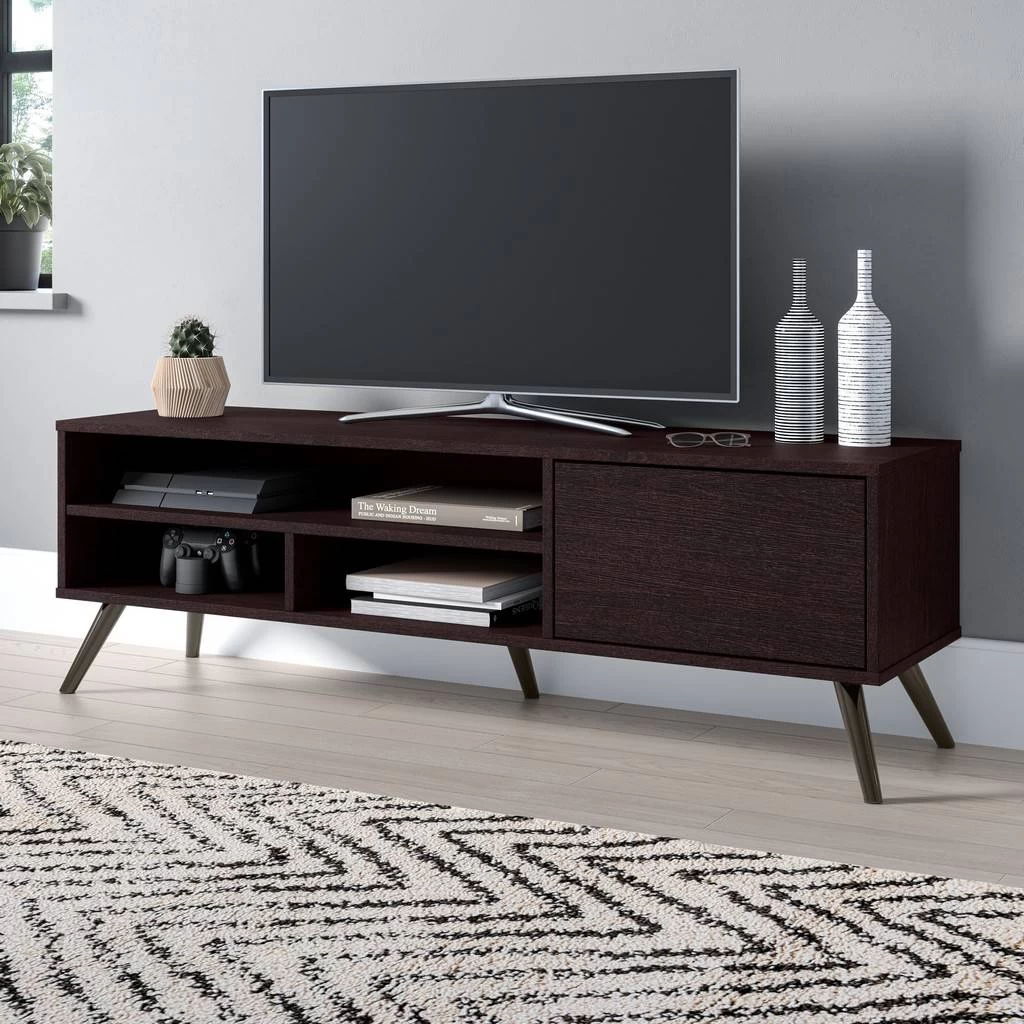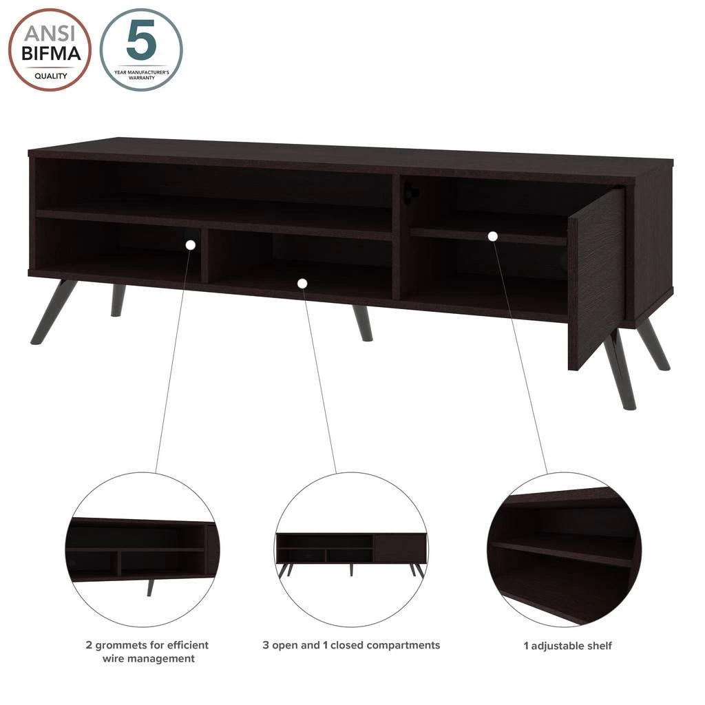 Set up a modest entertainment station with this stylish TV Stand. Durable materials ensure that your media console can withstand everyday damage from a busy environment. The angled metal legs add a contemporary touch to the unit and to your overall . Keep media equipment and accessories organized thanks to the 3 open storage areas. Smaller items can be placed in the closed storage compartment, which can easily be opened thanks to the convenient push latch found on the door. Keep those pesky wires and cables out of sight by using the 2 grommets found on the TV Stand. Backed by the Bestar 10 Year Manufacturer‘s Warranty. North American made with local and imported parts.
