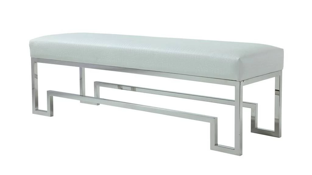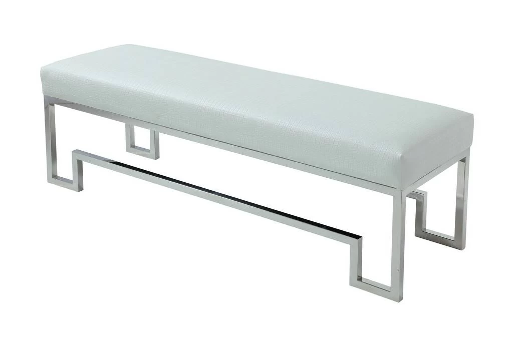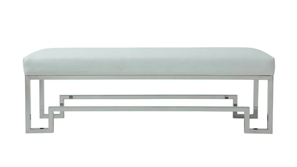 Gorgeous bench that features a high polished stainless steel base. The angular polished metal base topped with a textural cushion combine to create a luxurious seating experience. No assembly required. Seat height is 18″.