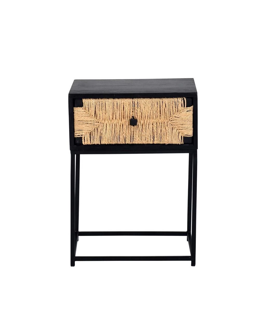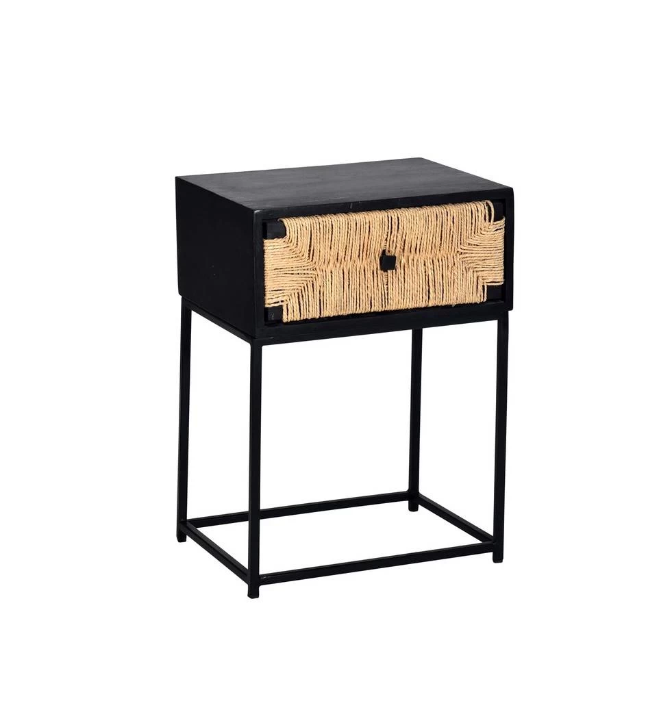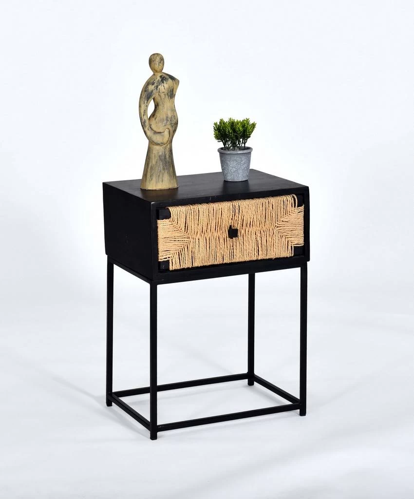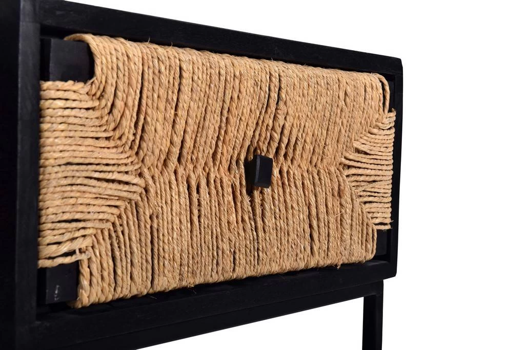 A great choice when different is the goal. No better way to spice up a than with a beautiful new nightstand. The mango wood in a black finish with a modern style black iron base. Drawer front is wrapped in a natural color woven jute that is simply breath taking. This will compliment almost any style.
