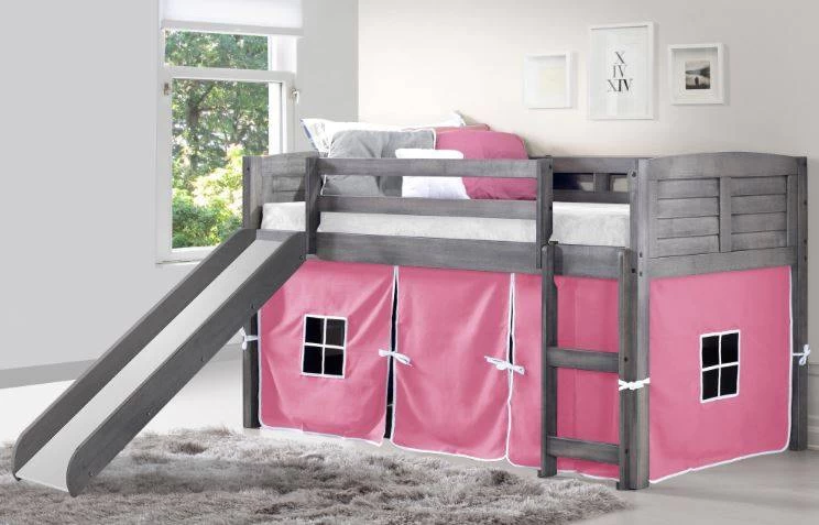 The louvered low loft bed makes a small room fun, with large under bed area for storage or play. The louvered design is timeless and can make a room easy to decorate and give it a warm inviting look. Tent fabric can be used as a fun play area or to conceal storage. The slide is a great way to start the day. This Donco Kids product will give your child years of enjoyment. Donco provides many different styles and colors to choose from.