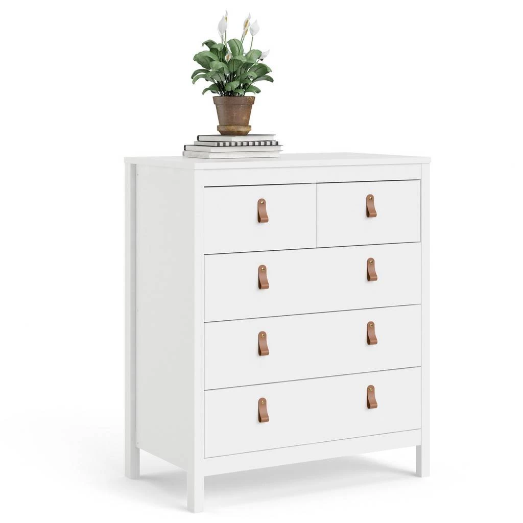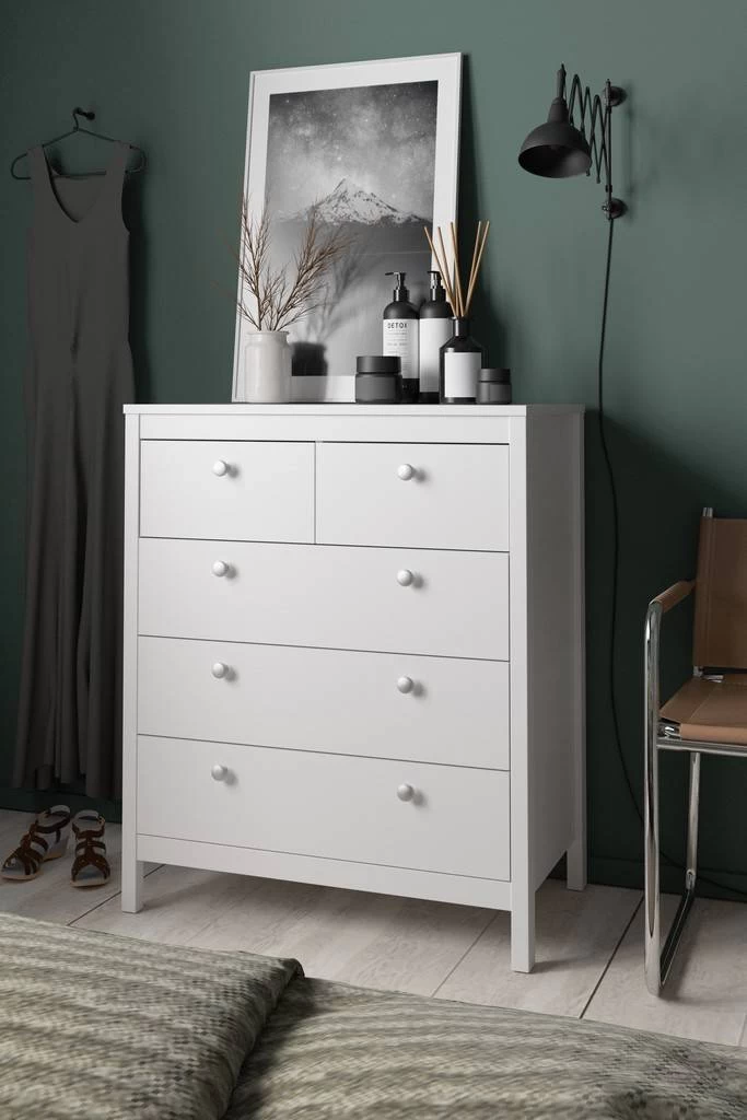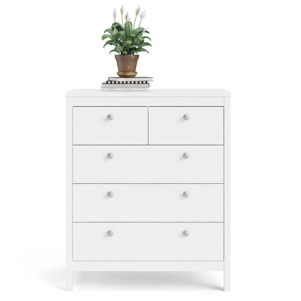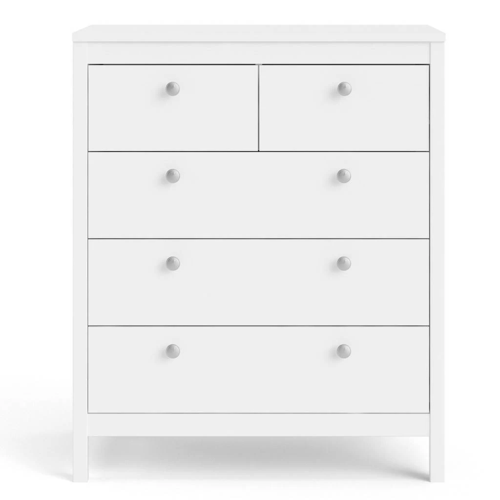 Enhance your or small space with the Madrid 5 Drawer Chest. It features a unique modern-traditional design that’s ideal for bedroom storage. The drawers are backed with metal drawer glides and comes with two types of handles-grey knobs and brown leather handles-to customize the look. The Madrid Chest has a durable foil surface that is easy to clean. Combine with other pieces from the Madrid collection to complete your bedroom space.