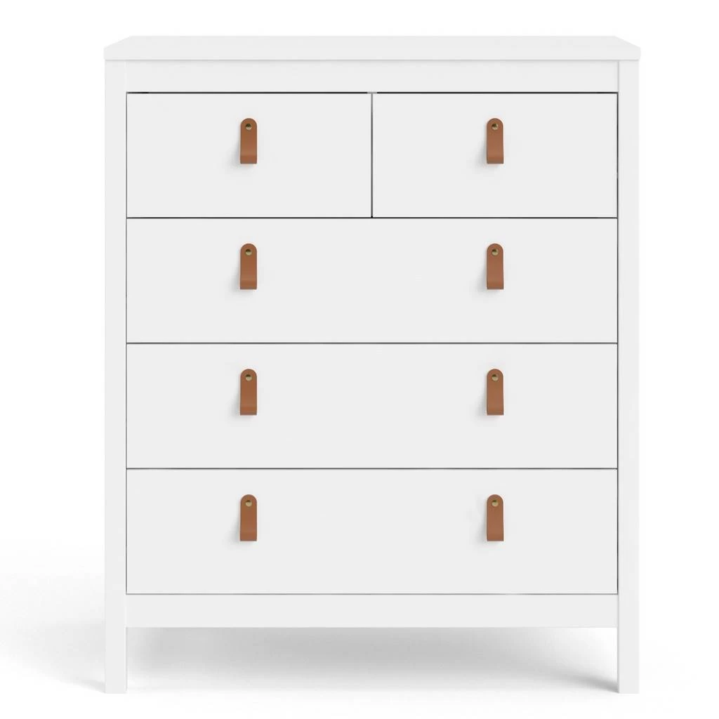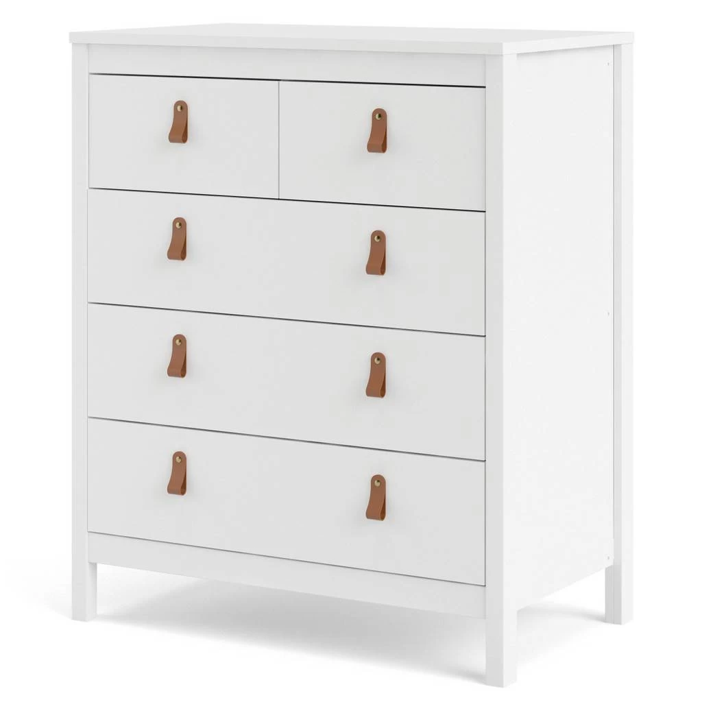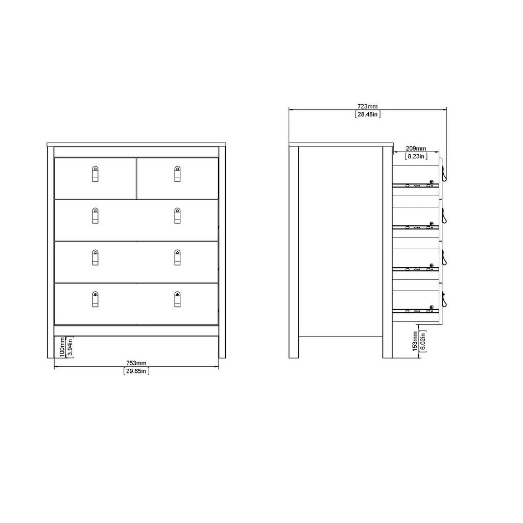 Enhance your or small space with the Madrid 5 Drawer Chest. It features a unique modern-traditional design that’s ideal for bedroom storage. The drawers are backed with metal drawer glides and comes with two types of handles-grey knobs and brown leather handles-to customize the look. The Madrid Chest has a durable foil surface that is easy to clean. Combine with other pieces from the Madrid collection to complete your bedroom space.