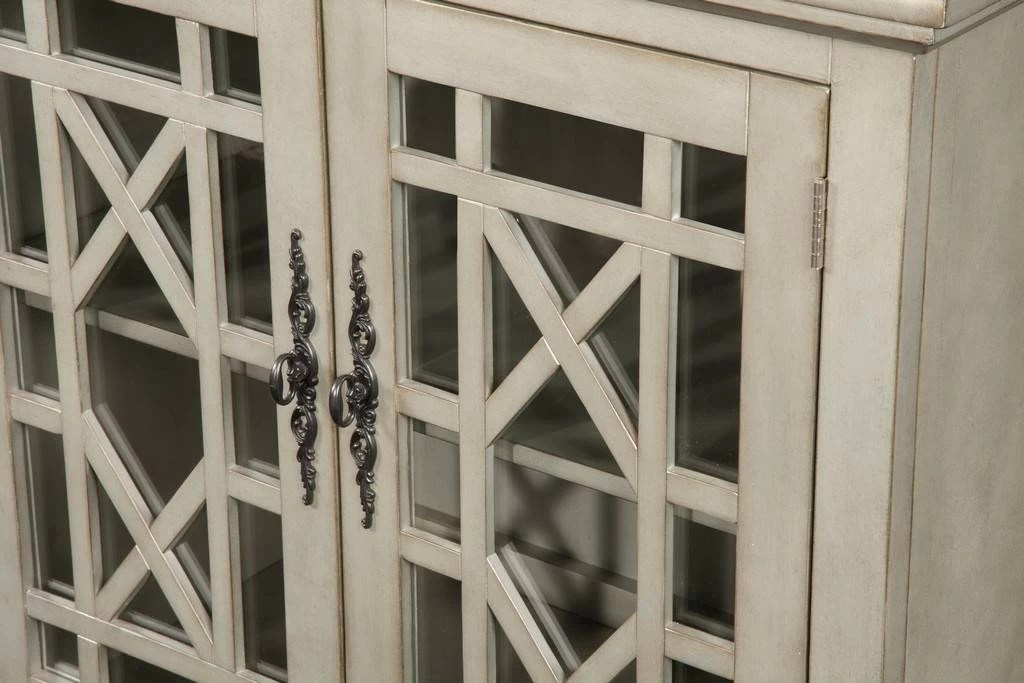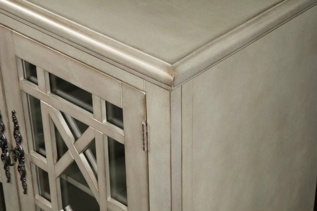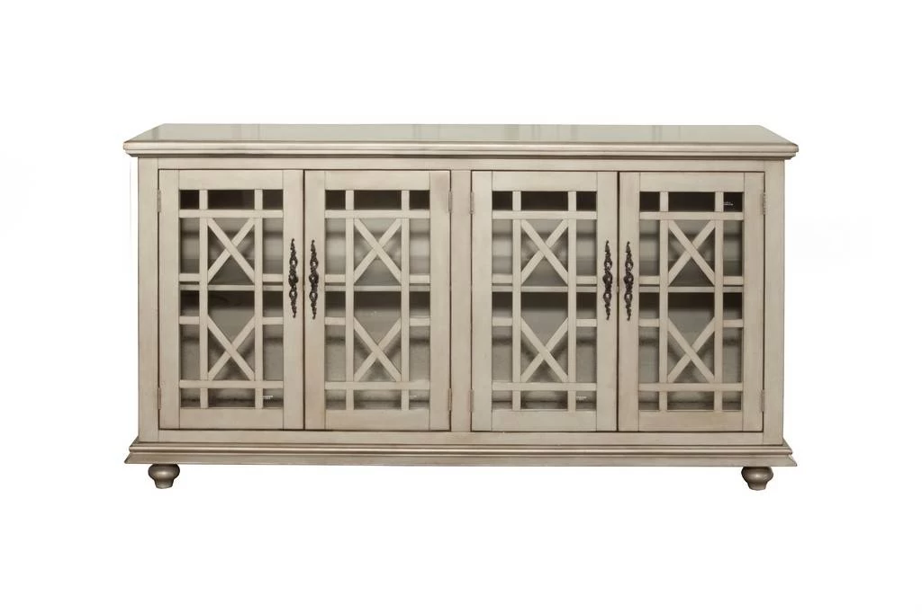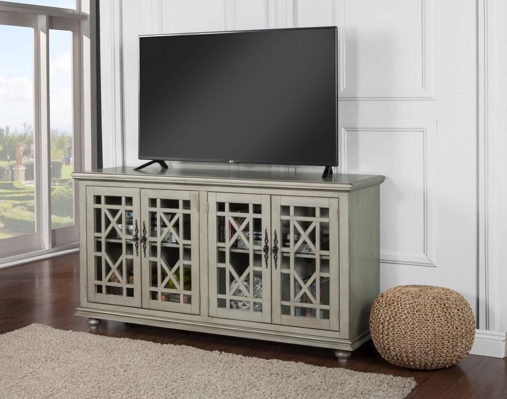 The Elegant TV Stand features a beautiful Antique Silver finish with sophisticated transitional styling inspired by design cues taken from Parisian antique markets. Elegant trellis details on the glass doors, intricately cast door pulls, turned bun feet, and architectural moldings are all blended together for an exquisite look. Each piece is slightly distressed with just the right amount of rub through at the edges to make it seem like this was a piece handed down through generations. The versatile design allows the piece to be used as an Entertainment Console, an Entry Hall Credenza, or as a Dining Room Server. Removable and adjustable shelves provide versatile storage options for audio, video, gaming components. Vertical wire management cutouts allow for easy access with multiple shelf configurations. Ideal for 65” Flat Panel TVs. ETA (Easy To Assemble). Anti-tip kit added for safety. Assembled Dimensions: 63″ W x 35″ H x 18″ D.