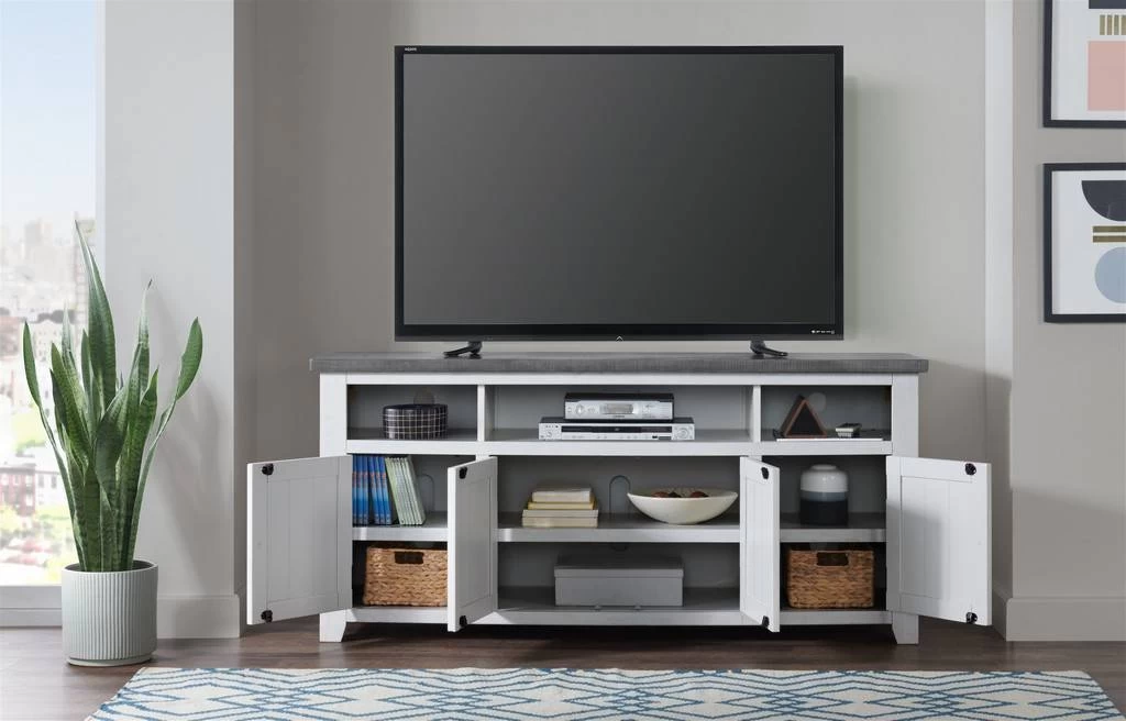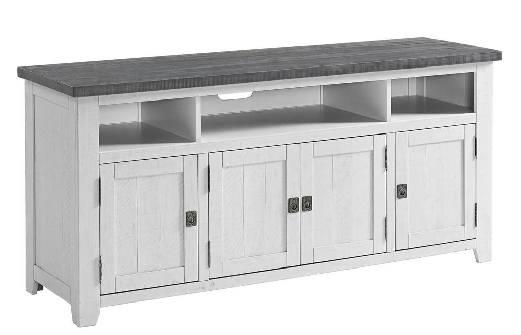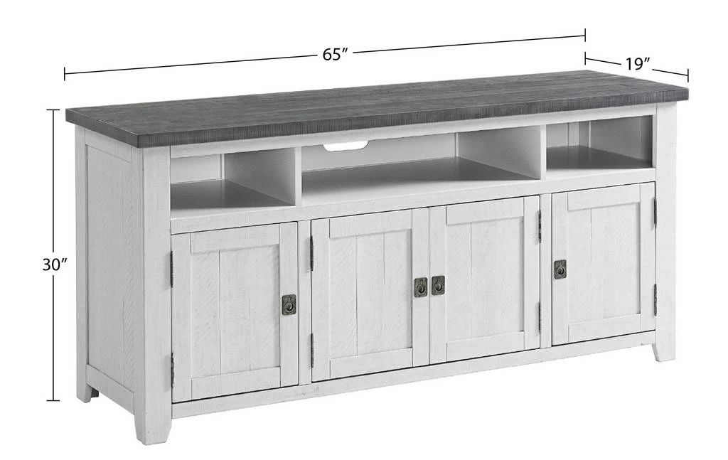 The Foundry TV Stand with its reclaimed lumber look with rough-hewn saw and distress marks fits in perfectly with rustic, farmhouse, and coastal . Features the Lightning Fast Assembly System: Easy, quick, and tool less assembly process allows for the TV stand to be assembled in 10 minutes or less. Constructed from solid New Zealand Radiata pine body and mdf back panel. Three (3) large, open component cubbies allow for plenty of space to store TV, video, audio and video game components. A total of four (4) doors give access to three cabinets, one large middle cabinet and two smaller cabinets on each side. Each cabinet features one adjustable and removable shelf along with vertical wire management cutouts. The recessed campaign-style door pulls offer a nice complement to the rustic finish details. Ideal for most TVs up to 70″. Assembly Required.
