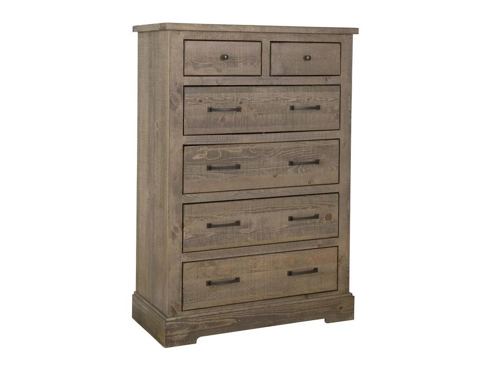 Rustic sophistication with a casual twist is presented in this new group. The rough sewn salvaged pine absorbs the weathered gray finish that creates an interesting variation in color that gives it that sought after vintage look. Solid wood salvaged pine construction framed in tongue and groove on case tops. This chest features solid wood drawer dado construction with metal drawer guides, simple single bracket base, graphite hardware featuring round knob with backplate and simplistic complimenting handle.