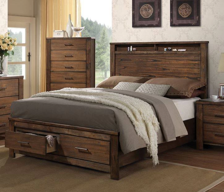 The Merrilee collection features spacious storage headboard and footboard. The pieces are nicely matched with oak finish coating and antique brass metal hardware, offering a warm and stylish relaxing environment. Each piece in collection is sold separately.