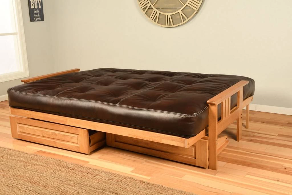 The mission style design on the arms of this solid wood futon frame cradle your mattress for sleeping comfort — pillows and sheets stay put when using it as a bed. This easy-to-adjust frame comes in an array of colors and the comfort of sofa height seating, making this futon ideal for your , , or family room . This futon frame has two optional drawers for out-of-sight storage. The mattress has hinged coil innersprings, covered with high density foam, and finished with decorative, tufted upholstery for softness and moldability allowing the mattress to rest in the perfect position every time.