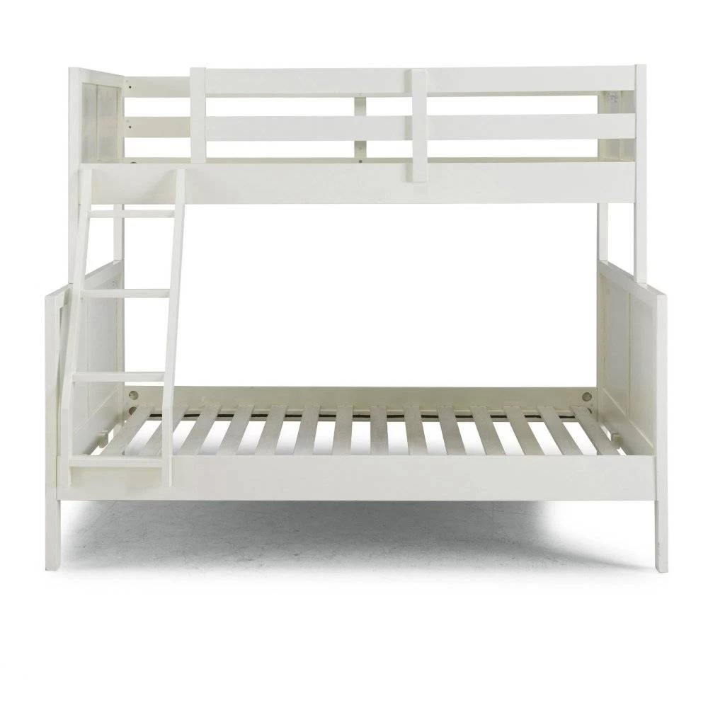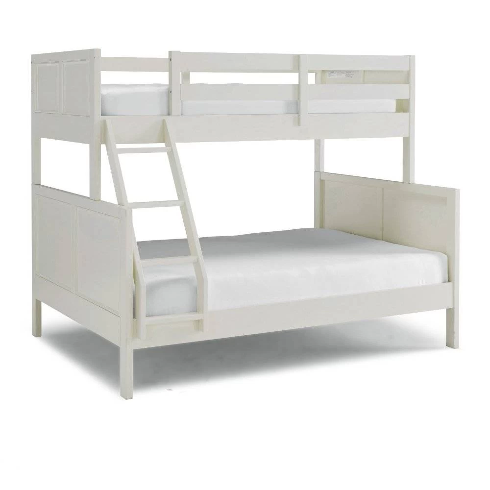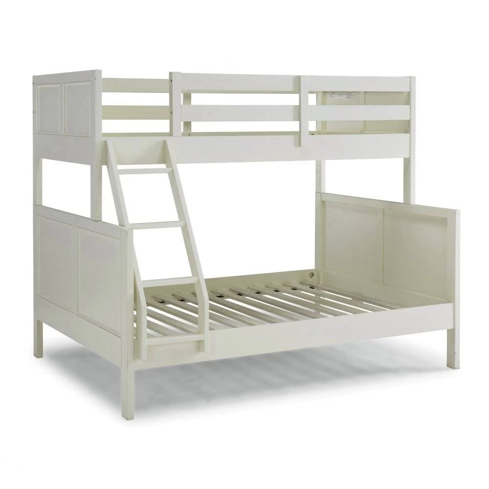 Transitional design that works in any décor. Crafted of solid hardwoods, laminated veneer lumber, and engineered woods, finished in an off-white satin painted finish. Laminated veneer lumber is a construction grade product used to make beams for framing and is stronger and more durable than solid wood. It is used in key areas for added strength and safety. Bed includes angled side ladder that attached to the lower and upper side rails for easy access to top bunk, and includes slates for mattress support. Lower bunk is sized for standard, full size mattress and the upper bunk for twin size mattress, mattresses not included. Duel frame paneled headboard and footboard for added design element with dual rail upper bunk side protection for safety and stability. Note finish and measurements may vary slightly, assembly required. W-78 ¾”, D-58 ½”, H-64 ¾”