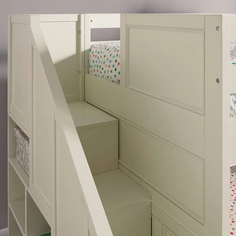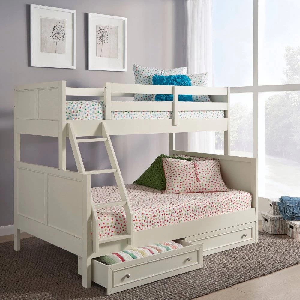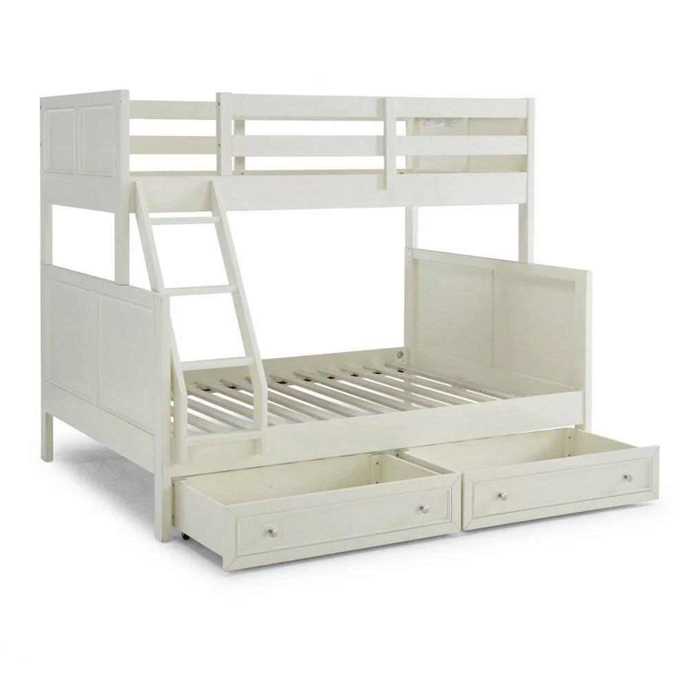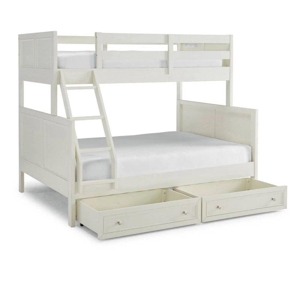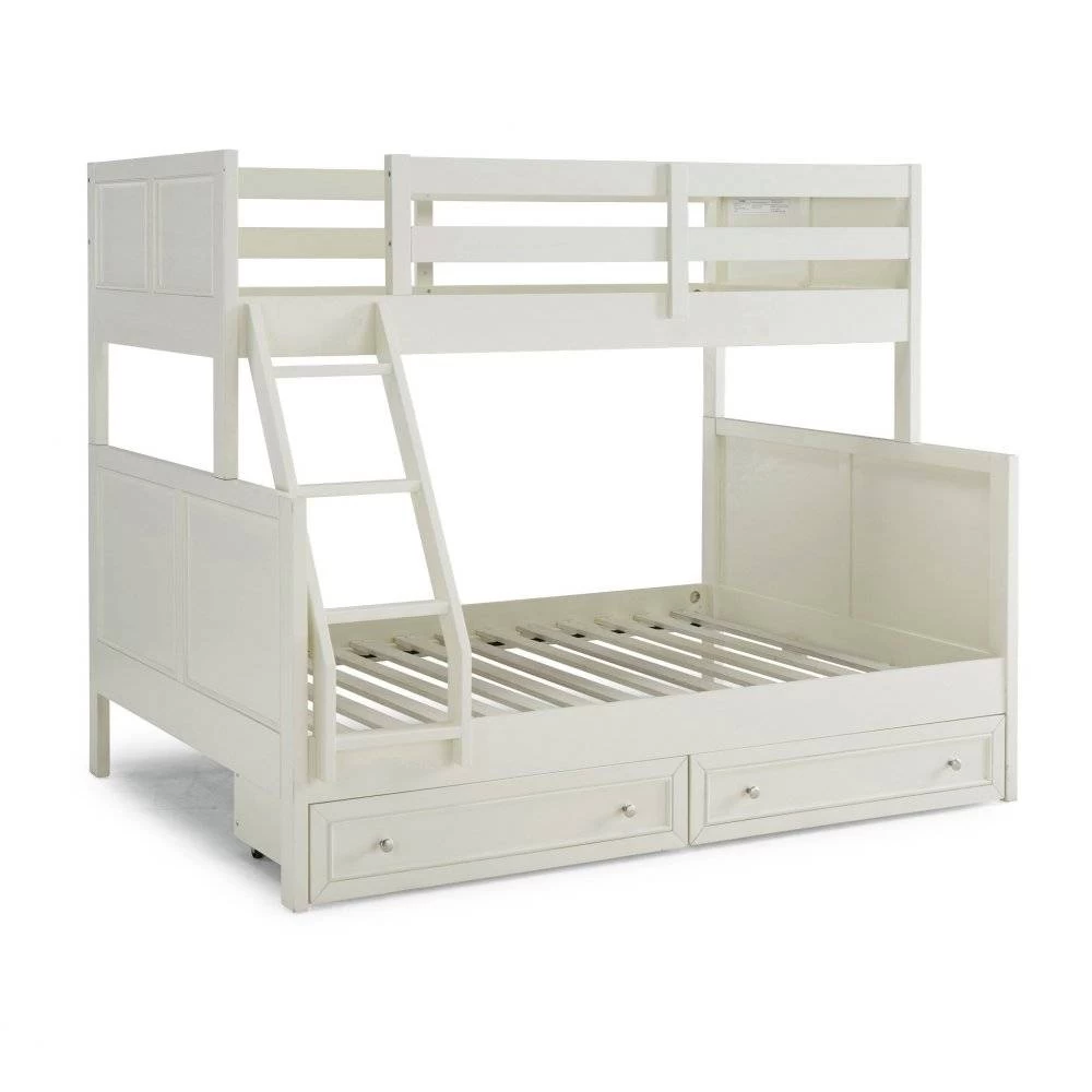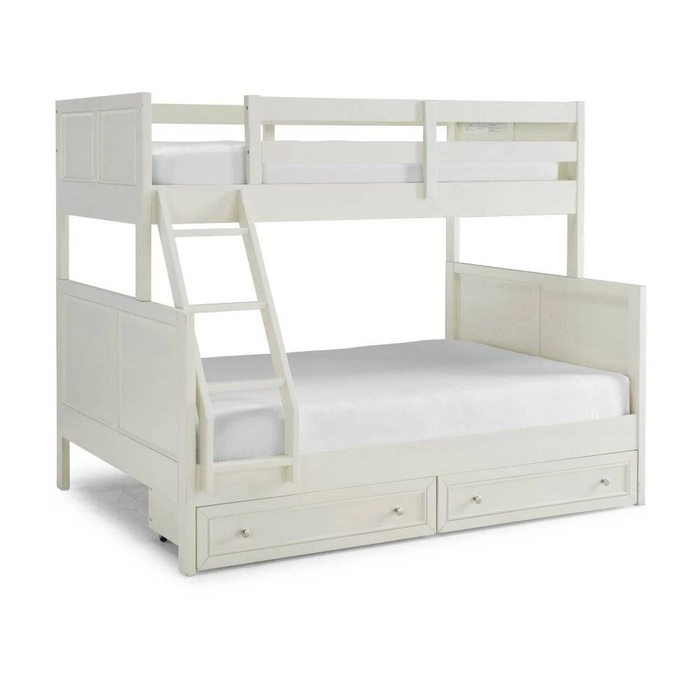 Transitional design that works in any décor. Crafted of solid hardwoods, laminated veneer lumber, and engineered woods, finished in an off-white satin painted finish. Laminated veneer lumber is a construction grade product used to make beams for framing and is stronger and more durable than solid wood. It is used in key areas for added strength and safety. Bed includes angled side ladder that attached to the lower and upper side rails for easy access to top bunk, and includes slates for mattress support. Lower bunk is sized for standard, full size mattress and the upper bunk for twin size mattress, mattresses not included. Duel frame paneled headboard and footboard for added design element with dual rail upper bunk side protection for safety and stability. 2 under the bed storage drawer units, that operate on casters, open to drawers that are 18 ¼” deep, with 6” of height. Note finish and measurements may vary slightly, assembly required. W-78 ¾”, D-58 ½”, H-64 ¾”