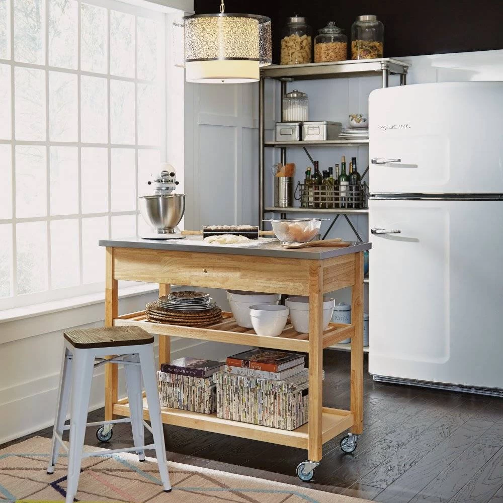 Home Styles Kitchen Cart w/Stainless Steel top features a solid wood construction in natural finish; two easy open utility drawers on metal glides with brushed steel hardware, adjustable slotted middle shelf can also be used as a wine rack; solid bottom shelf; brushed steel towel holder, and heavy duty locking rubber casters. Size: 44w 20.5dx 36h