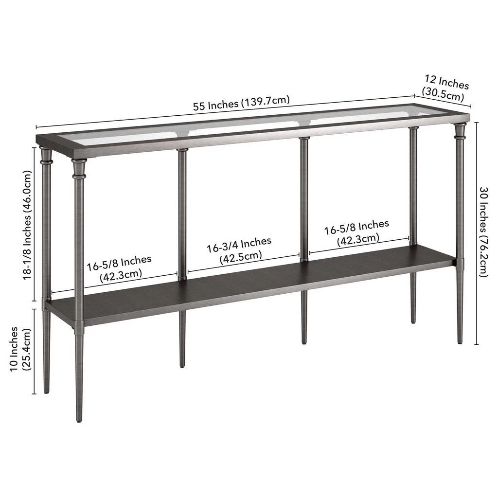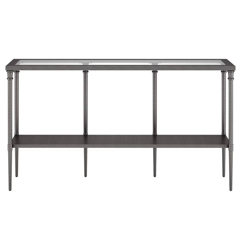 Bring streamlined design to your or entryway with this modern console table. Crafted of steel in a metallic finish, this console table features a two-tiered rectangular silhouette with a solid metal shelf perfect for storing mail, keys, knicknacks and more. The glass tabletop provides a perfect platform for framed photos or a pair of stylish lamps.