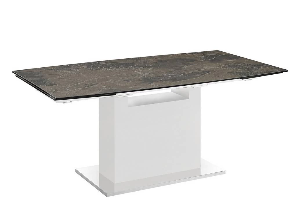 The OLIVIA extendable dining table in brown marbled porcelain top on glass with high gloss white lacquer base by Talenti Casa features clean, modern lines adding a sophisticated look and edge to any room.