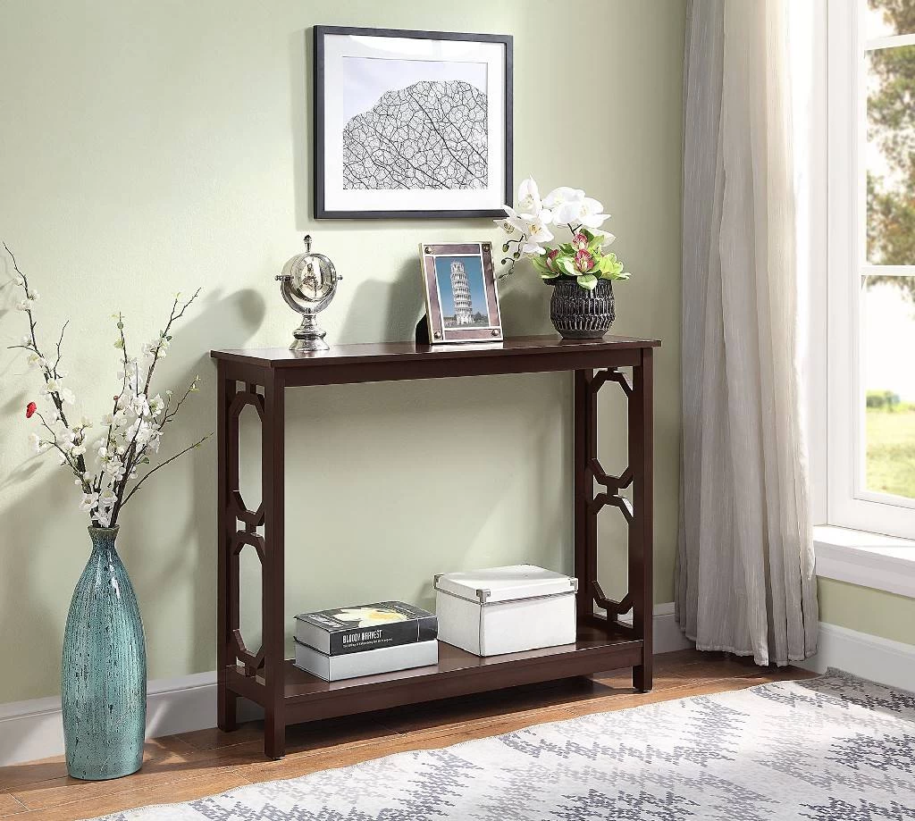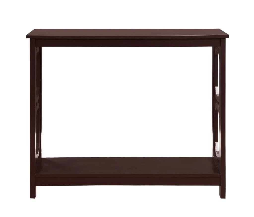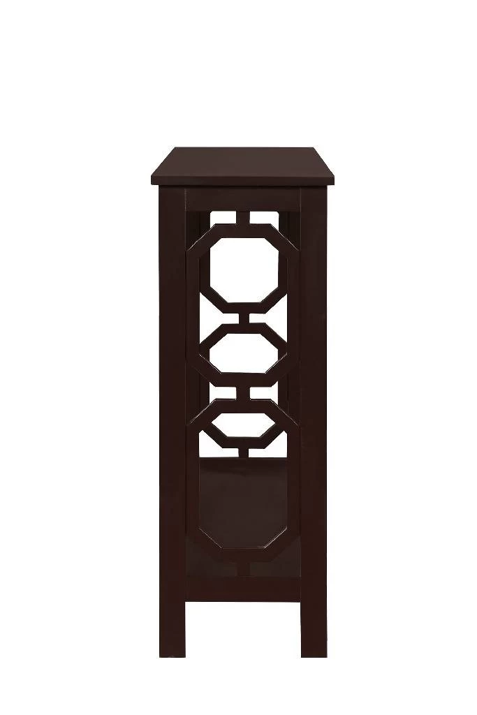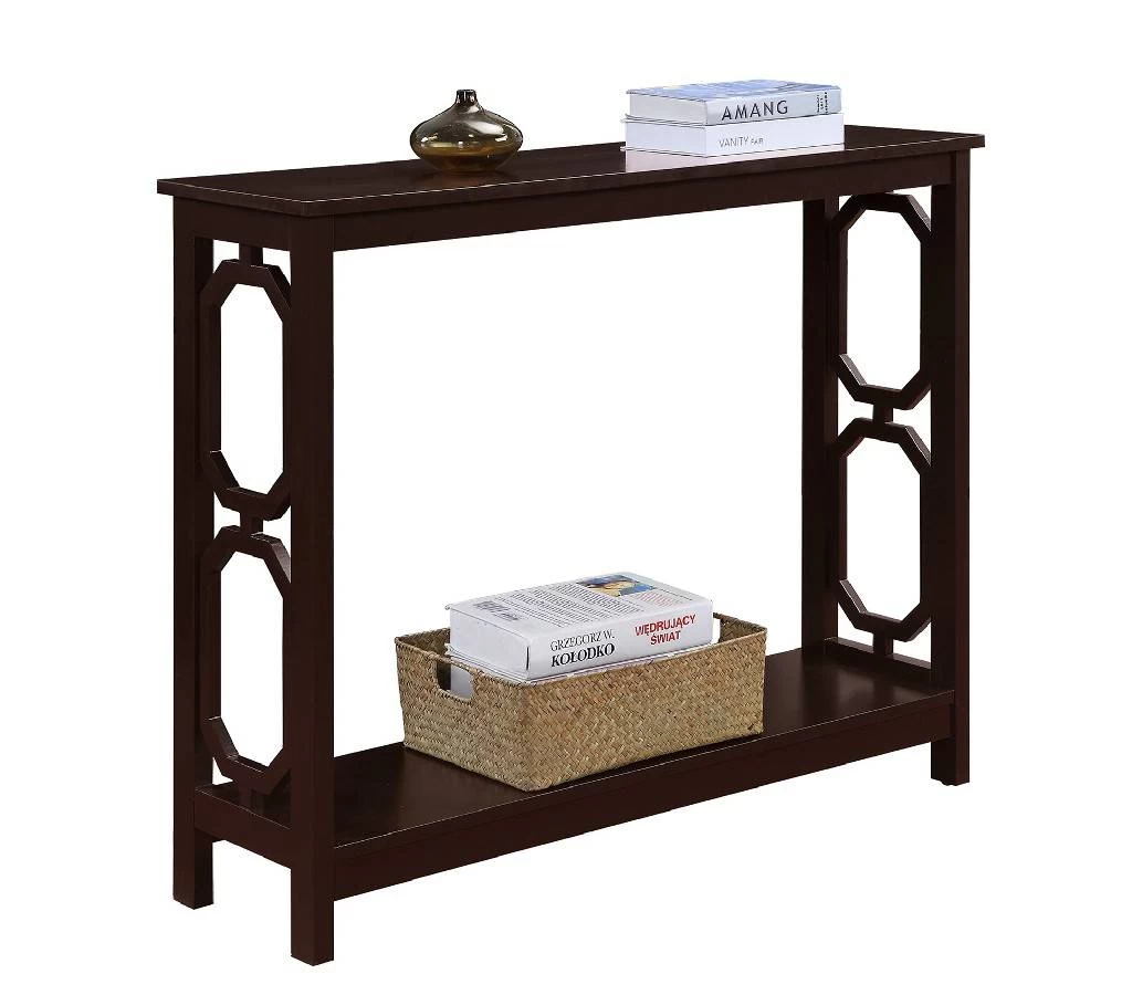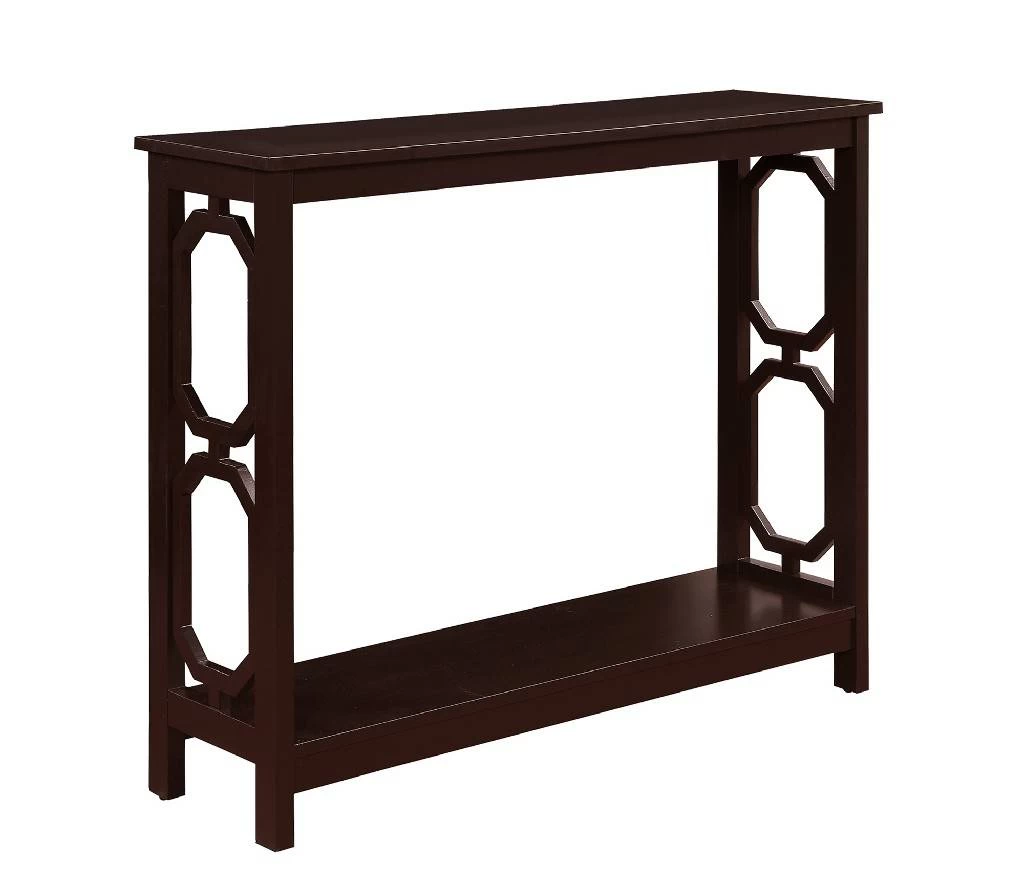 Add some subtle geometric fun to your entryway or family room with the Omega Console Table with Shelf by Convenience Concepts. Available in multiple finishes and great for smaller spaces; this contemporary console table with a pop of pattern is sure to make a statement in any room in your home. This simple yet eye-catching design showcases clean lines and beautiful octagon side cut-outs. Two tiers of spacious shelving offer plenty of room for home decorations and storage needs. Crafted for long-term use; this sleek table is engineered from manufactured wood and finished with smooth non-lead-based paint. Coordinate with additional contemporary pieces from the beautiful Omega Collection by Convenience Concepts; each sold separately.