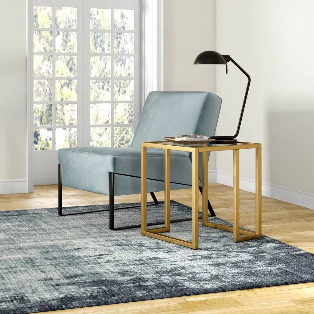 Offset framed supports and clean contemporary lines make this side table stand out in your , den, or . Crafted of steel and tempered glass in a warm neutral tone, this table is the perfect complement to your modern or industrial-inspired space. Its modest dimensions create storage or display opportunities in evn your smallest spaces.