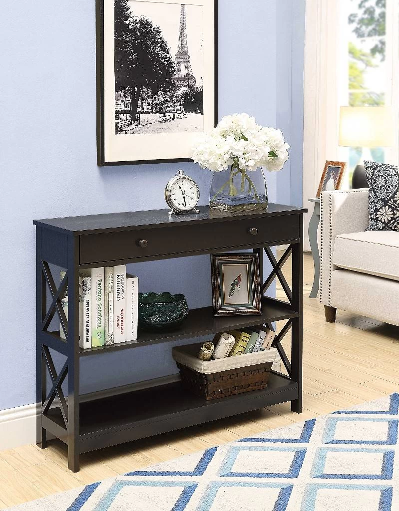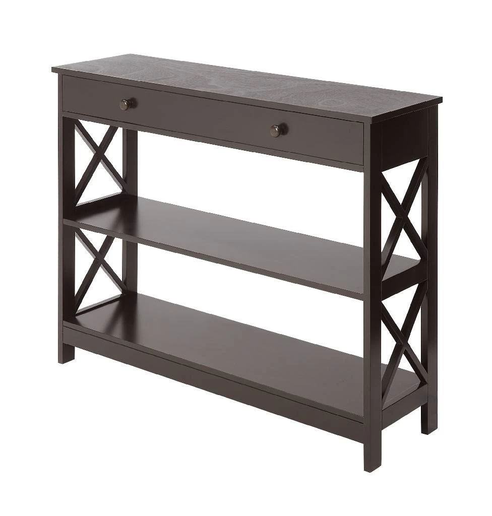 Make your home truly timeless with the Oxford 1 Drawer Console Table with Shelves by Convenience Concepts. This transitional piece features a pull-out drawer on smooth roller slides with two stylish drawer knobs for easy accessibility. The spacious drawer offers plenty of room to stow away entryway essentials and everyday necessities. The X-frame side panels and the three tiers of shelving make this console the perfect decorative piece to display in any room of your home. Beautifully crafted from MDF; non-lead-based paint; and particleboard; this unit is sure to last. This item is sure to last thanks to its easy assembly and maintenance-free design. Add coordinating pieces to your home from the Oxford Collection by Convenience Concepts; each sold separately.