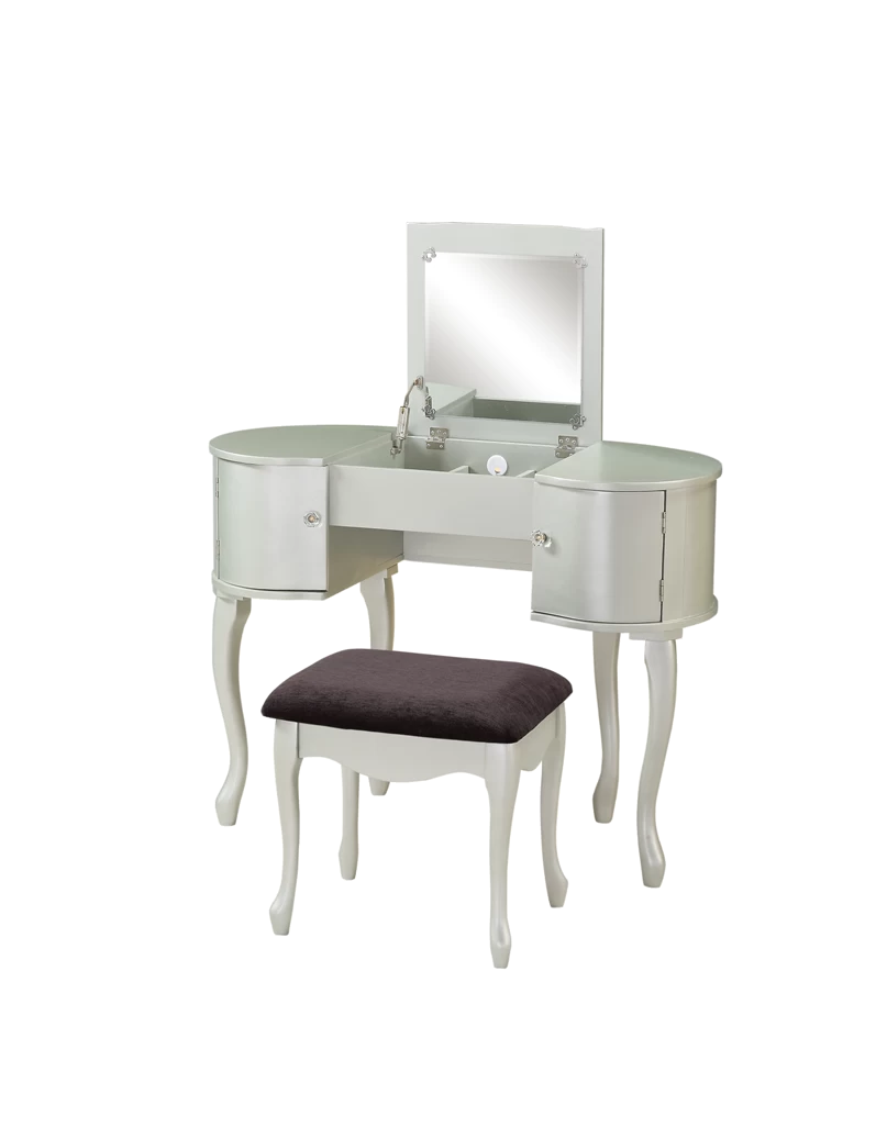 Glamorous in its design, the Paloma Vanity Set has a unique rounded style. A flip top lifts to reveal a large mirror and hidden storage space. Doors opens on each side of the vanity providing additional storage space. Small round silver knobs grace the fronts of the doors. A complementary stool has curvy legs and is topped with a grey microfiber seat. Ideal for a contemporary or modern space.