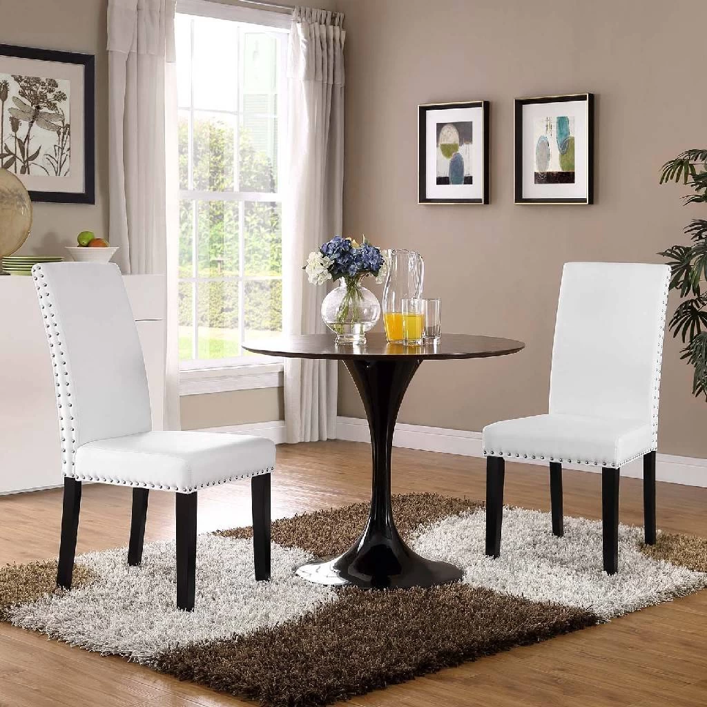 Wrap up moments of quality seating with the Parcel dining chair. Finely upholstered in faux leather with a nail-head trim, Parcel delivers a concise offering that enhances the dining experience in a subtle and unassuming way. Padded with dense foam and solid stained wood legs. Set Includes Two – Parcel Dining Side Chair
