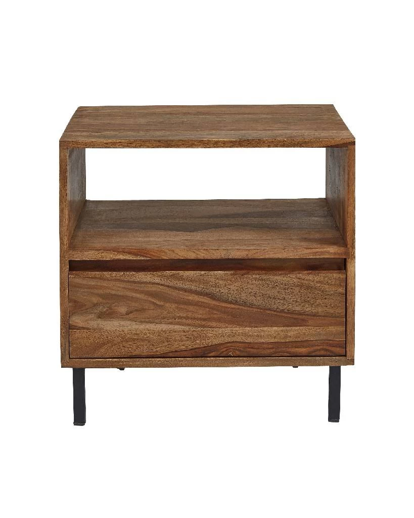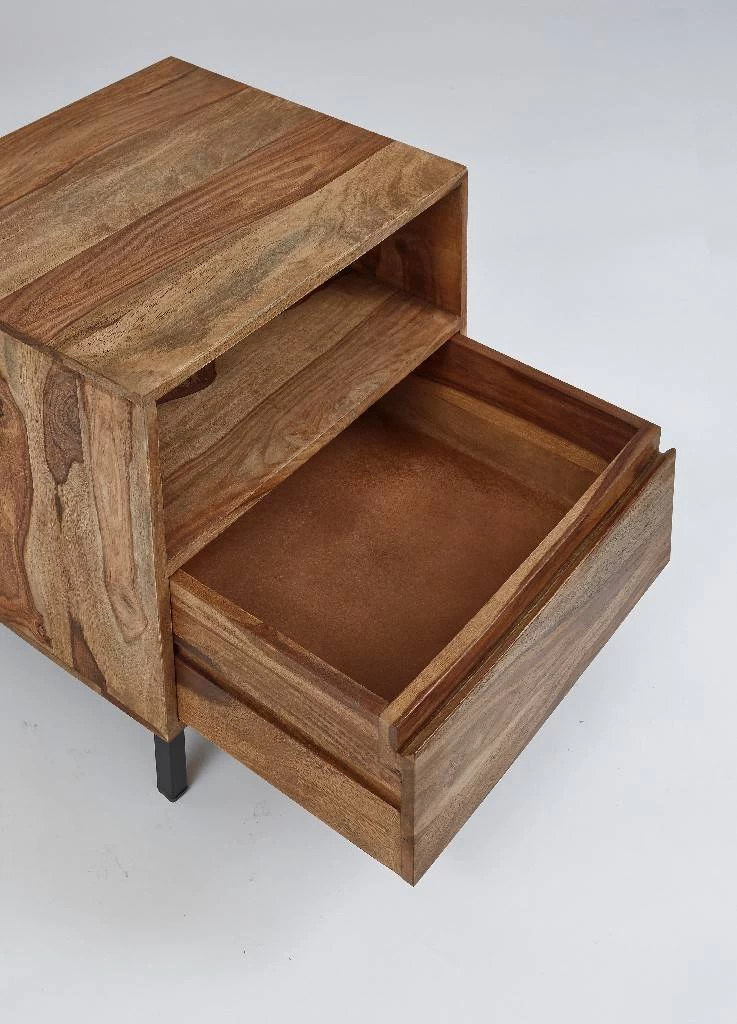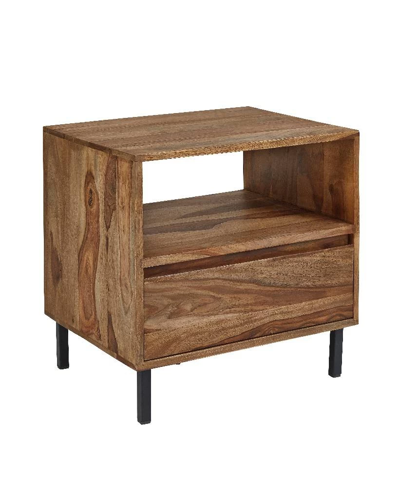 This great little side table is a great companion to a modern setting. The finish is so versatile and metal legs are a cool detail that everyone loves. The routed out finger pulls is the best part. So sophisticated and eclectic.