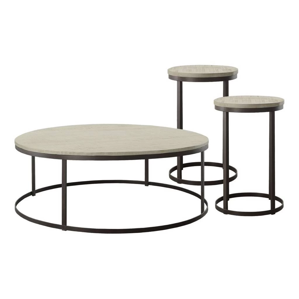 Bring home this industrial-styled 3PC Occasional Set, including a coffee table and two end tables, featuring a black metal base beautifully paired with a light colored top. Constructed of solid pine, they each accent distressed markings that add lovely texture across the top. The round design makes the coffee table a perfect center piece to place around large seating areas and allows the end tables to easily slip into smaller spaces. With the absence of any sharp corners, this occasional set is safe, polished, and ideal to place inside your home.