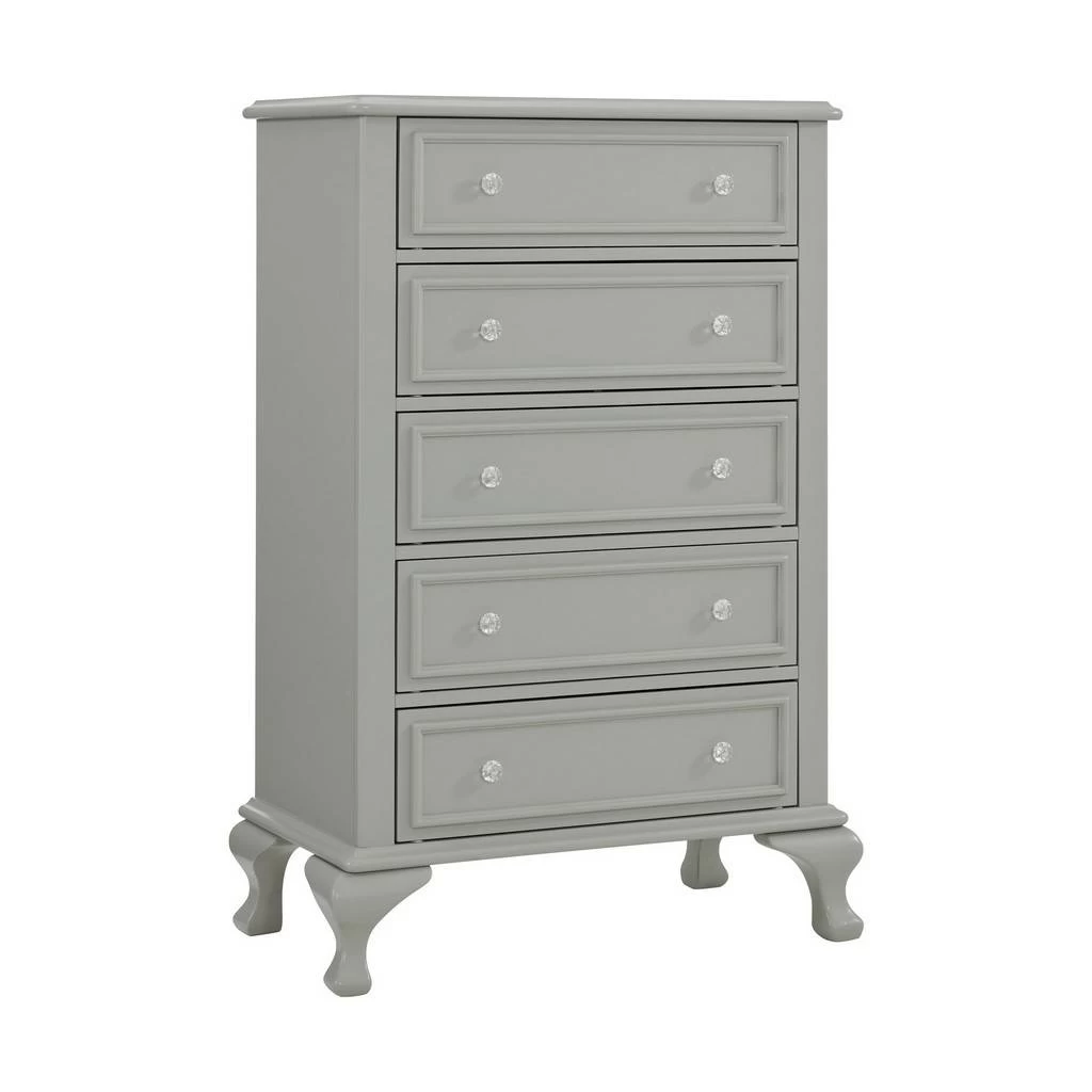 The Picket House Furnishings Jenna 5-Drawer Chest is the perfect addition to your little ones ! This vertical chest comes with five, spacious drawers; perfect for neatly storing away all of your belongings. Raised panel drawer fronts are accompanied by crystal-like drawer knobs, adding an extra element of style to this already stylish set. The classic white finish is easy to match with any existing . Bevel edges and arched cabriole feet complete the look of this transitional design.