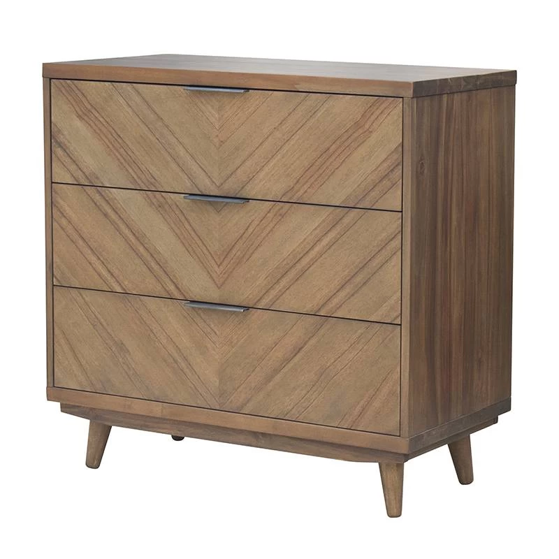 The book-matched veneer plays out in a popular chevron pattern, recreating a classic mid-century motif in the Piero Chevron Dresser. The warm wood tones, recessed drawer pulls and splayed legs complete the authentic mid-century look. Match it with the Piero Queen Headboard and Nightstand for a ensemble that really clicks. Some assembly required, available in Monterey Brown.