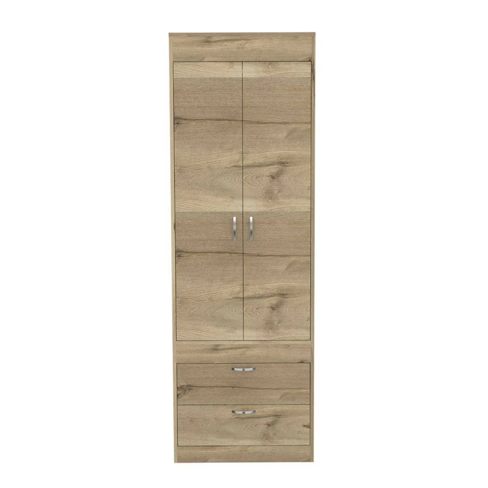 This armoire is the perfect solution for extra storage in limited space rooms! With its two doors( 43,9”H X 10,9”W) and two spacious drawers (21,9”W X 6,9”H) and stylish light oak-black particleboard finish, you’ll have plenty of room to store anything you need. Plus, its covered hanging rod makes it ideal for your , garage, living room, or kitchen. Don’t let a lack of storage space keep you from having the home you’ve always wanted – get the Portugal Collection Armoire today!