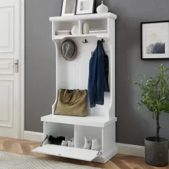 Bring organization to one of the busiest areas of the home with the Prepac Corner Hall Tree. This organizer has a compact functional design that is ideal for tight entryways, hallways, mudrooms, etc. A row of 4 hooks keeps scarves, jackets, umbrellas at hand and the 3 compartments are a convenient spot for storing baskets, shoes, keys, mail and any other entryway clutter.