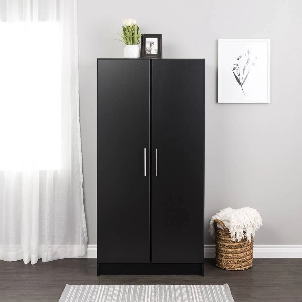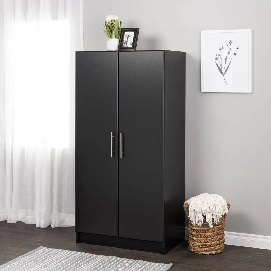 Storage never goes out of style and the Elite Wardrobe Cabinet with Storage is the ideal, multi-functional cabinet for busy households. Combining an armoire and a shelving unit, it fits everyone’s needs. The wardrobe side includes a 19-inch wide dowel for hanging clothes, with a compartment height of 42.5 inches making it just the right height for button-up dress shirts and blazers. Fixed shelves above and below create compartments where you can stash hats, shoes, totes, blankets or boxes containing any assortment of objects imaginable. On the right side is a compartment with one fixed and two adjustable shelves which are ideal for storing just about anything. All of this behind MDF doors with soft rounded edges and modern handles.