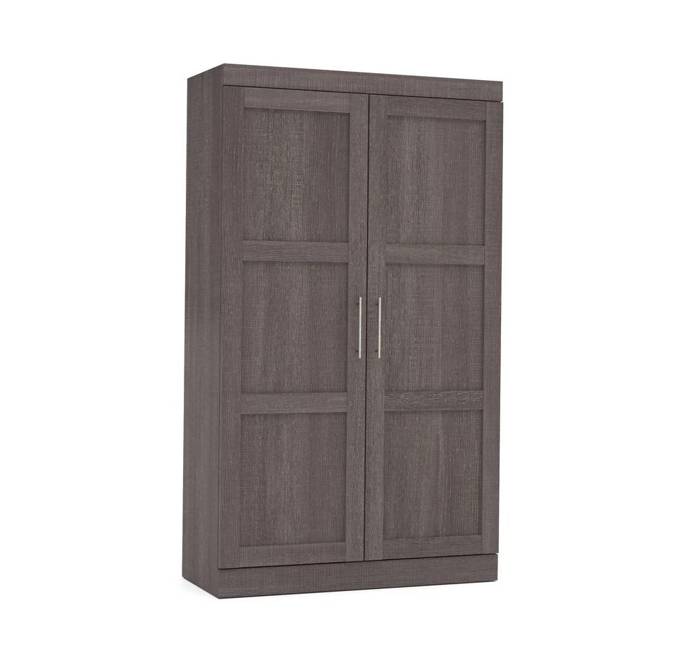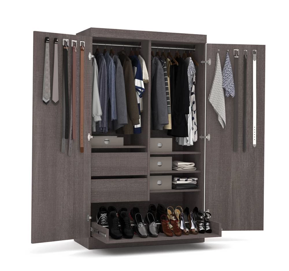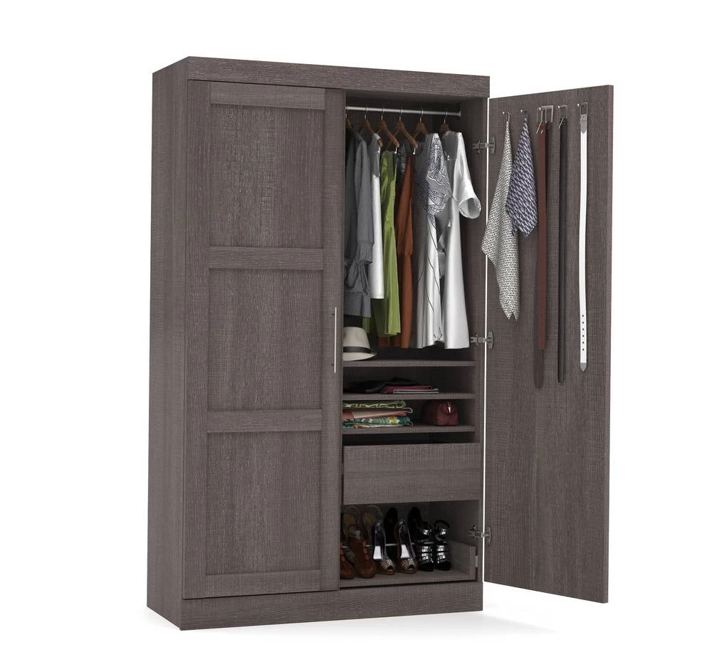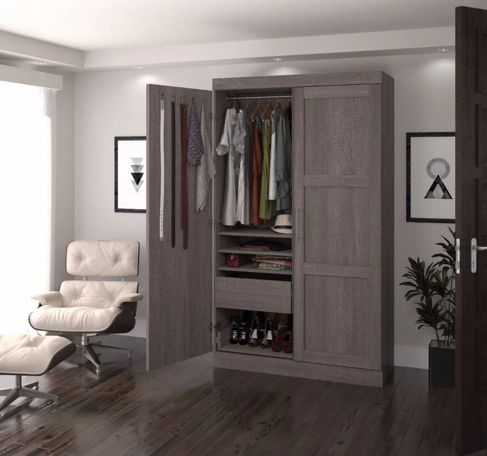 Combining style and convenience, Pur by Bestar is the perfect solution to furnished condos, lofts, studios, guest’s rooms and home offices. The collection brings multi functionality to a single room. Four adjustable shelves that can be installed on the left or right part of the armoire. Two adjustable drawers on ball bearing slides for smooth and silent operation, can be installed on the left or the right part of the armoire. Two shaker doors. Two poles to hang clothes. Ten hooks to hang ties, belts or other accessories. Metal shoe rack on ball bearing slides so all shoes are easily accessible. Additional storage options available. Assembly required. Easy to install.