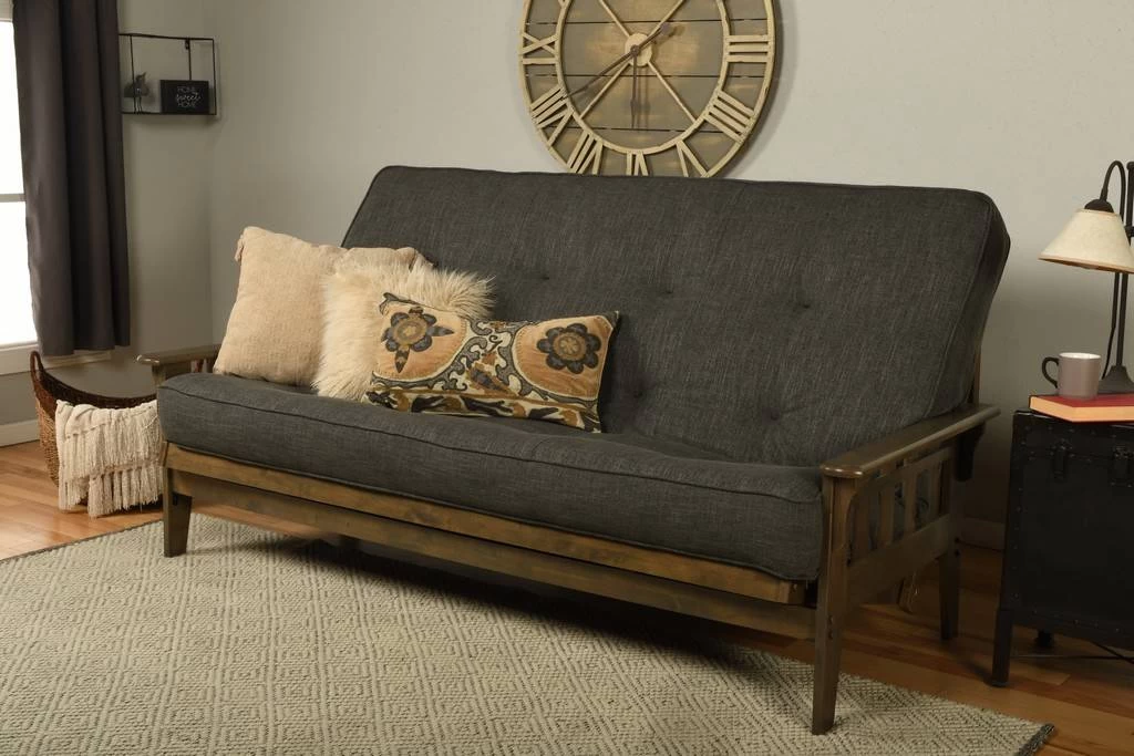 Classic charm combines with modern convenience with this solid wood futon. This piece is made from sustainable, plantation-grown hardwood and has been finished with lush walnut brown stain, allowing the beauty of the woodgrain to show. Everything you need to set up your futon frame is included; no additional tools are required and easily adjusts from sitting to sleeping positions. The mattress offers hinged coil innersprings, covered with high density foam, and finished with decorative, tufted upholstery for softness and moldability allowing the mattress to rest in the perfect position every time.