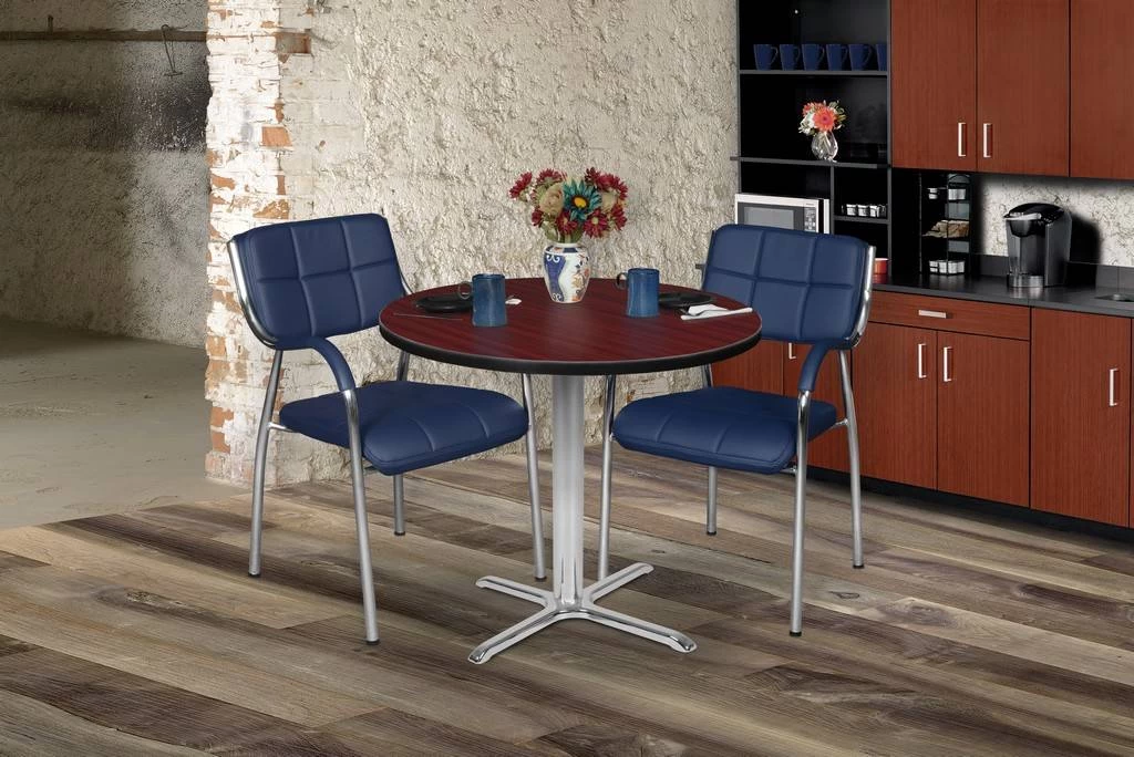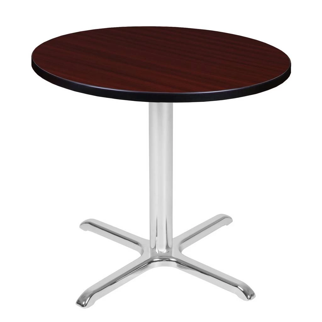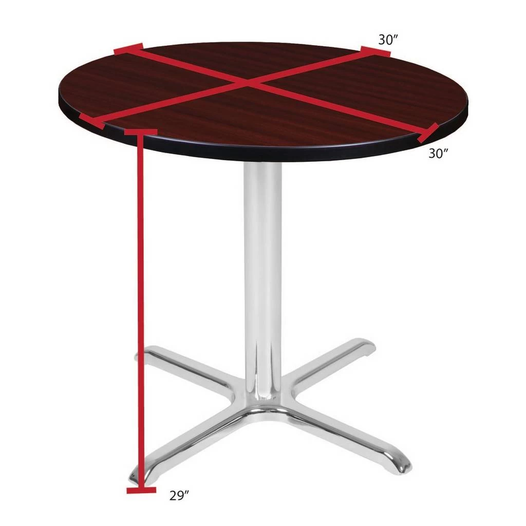 No matter what room you’re planning, plan it with Cain tables. These modern tables are a perfect fit in stylish café or coffee shop settings as well as lunch rooms, kitchens or common work areas. This 30-inch round table is constructed of a thermal fused melamine laminate tabletop that is 1-inch thick and finished with a black T-Mold edge band. This Mahogany tabletop is double-sided and finished in Mocha Walnut on the other side. Simply pick the side you like and install the base on the other. Self tapping wood screws and a placement template are included. Laminates are scratch, stain and scald resistant and wipe clean easily. The classic X-Base base is constructed of durable stamped steel that is built to withstand daily wear and tear and has a chrome finish that is sure to match any . Hidden adjustable glides keep the tabletop level and are easy to adjust. Cain tables are backed by a 10-Year Limited Manufacturer’s Warranty.