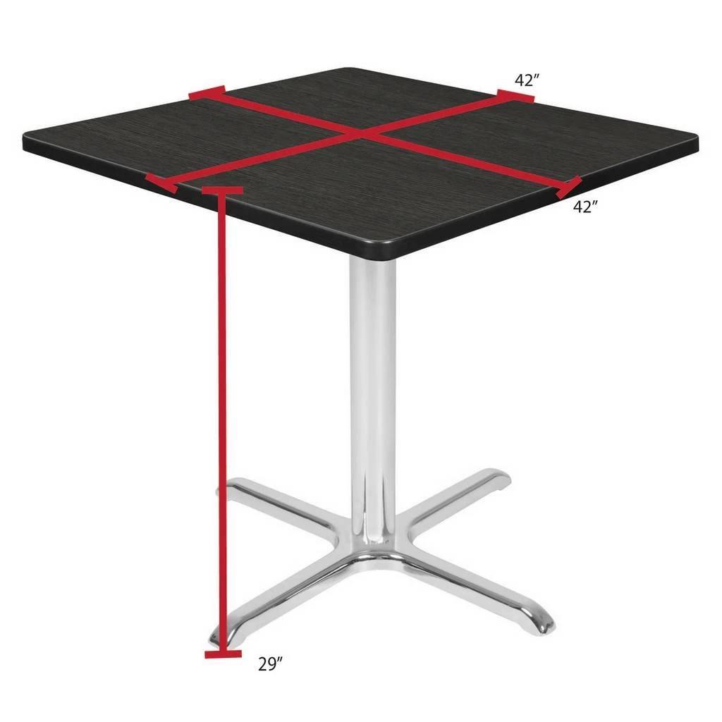 No matter what room you’re planning, plan it with Cain tables. These modern tables are a perfect fit in stylish café or coffee shop settings as well as lunch rooms, kitchens or common work areas. This 42-inch square table is constructed of a thermal fused melamine laminate tabletop that is 1-inch thick and finished with a black T-Mold edge band. This Ash Grey tabletop is double-sided and finished in White on the other side. Rounded corners make the table safer for everyone. Simply pick the side you like and install the base on the other. Self tapping wood screws and a placement template are included. Laminates are scratch, stain and scald resistant and wipe clean easily. The classic X-Base base is constructed of durable stamped steel that is built to withstand daily wear and tear and has a chrome finish that is sure to match any . Hidden adjustable glides keep the tabletop level and are easy to adjust. Cain tables are backed by a 10-Year Limited Manufacturer’s Warranty.